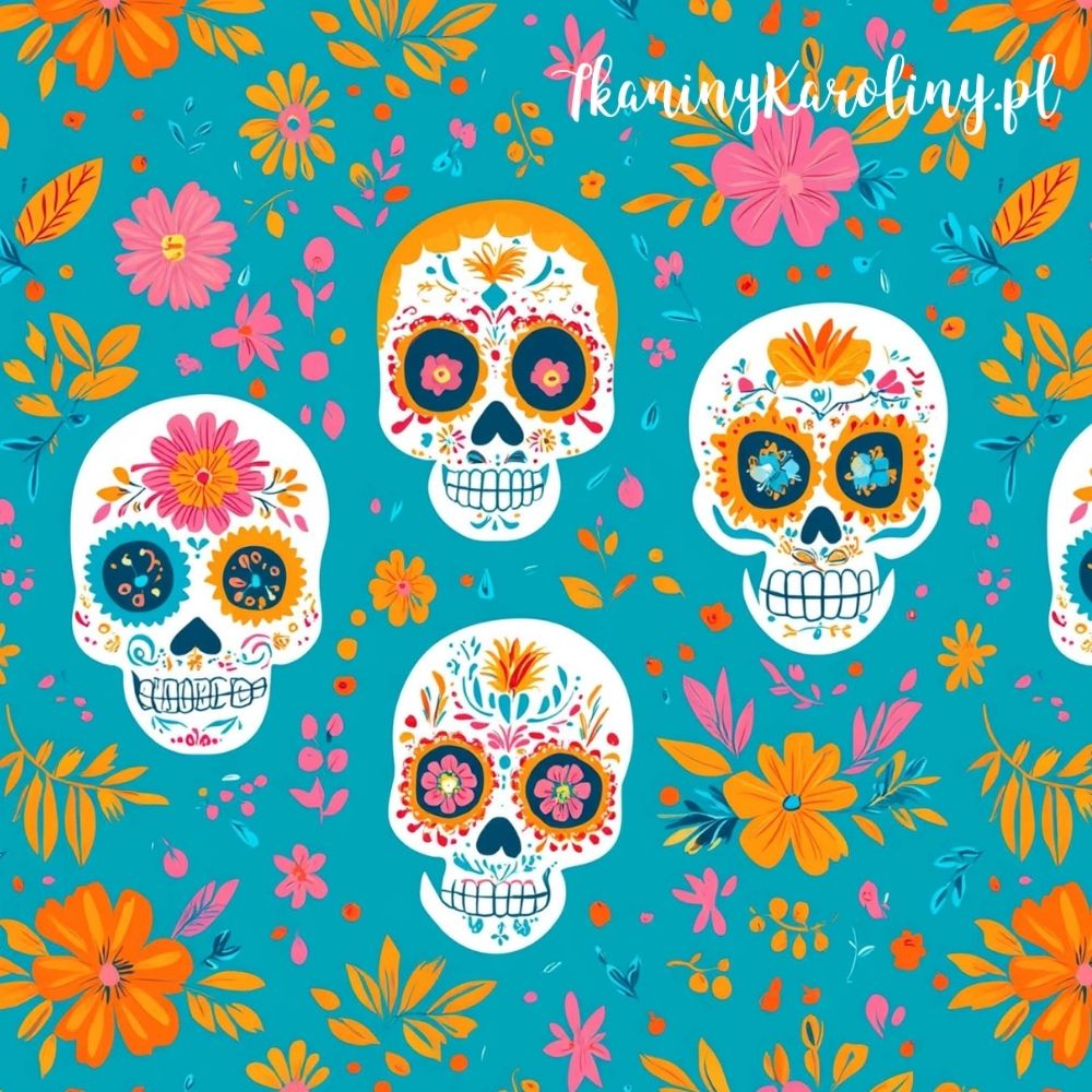 Białe czaszki w towarzystwie żółtych i różowych kwiatów tańczą na turkusowym tle. Radosny, kolorowy motyw w duchu Día de los Muertos, idealny do wesołych i również letnich projektów.