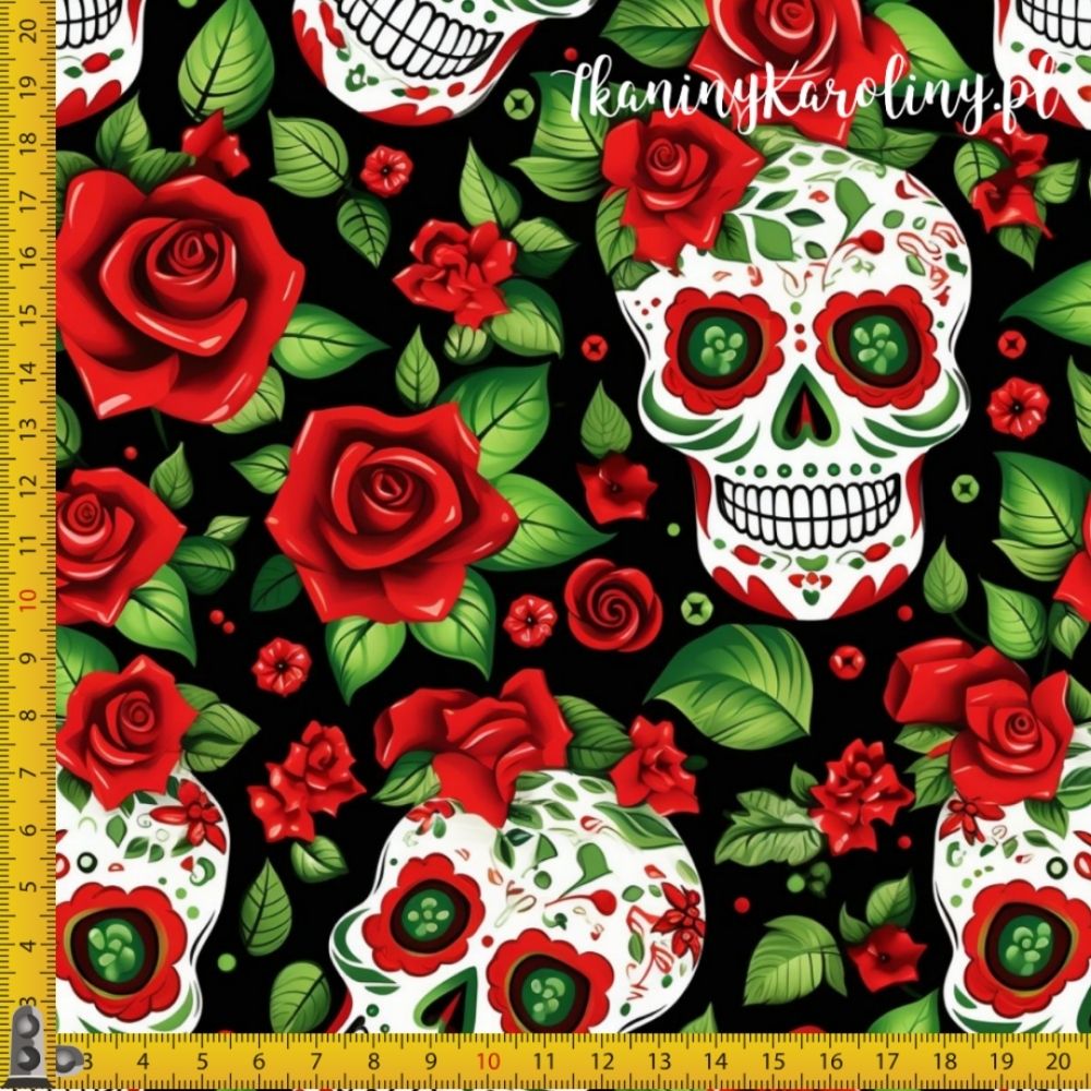Czerwone róże i białe czaszki na czarnym tle – elegancko i kwiatowo, z odrobiną figlarnej zadziorności, jak bukiet, który lubi psoty, a nie grozę.