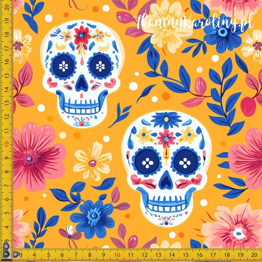 SOFTSHELL WODOODPORNY Halloween, Día de los Muertos - białe czaszki w kwiatach i kropki na pomarańczowym tle [6-8]