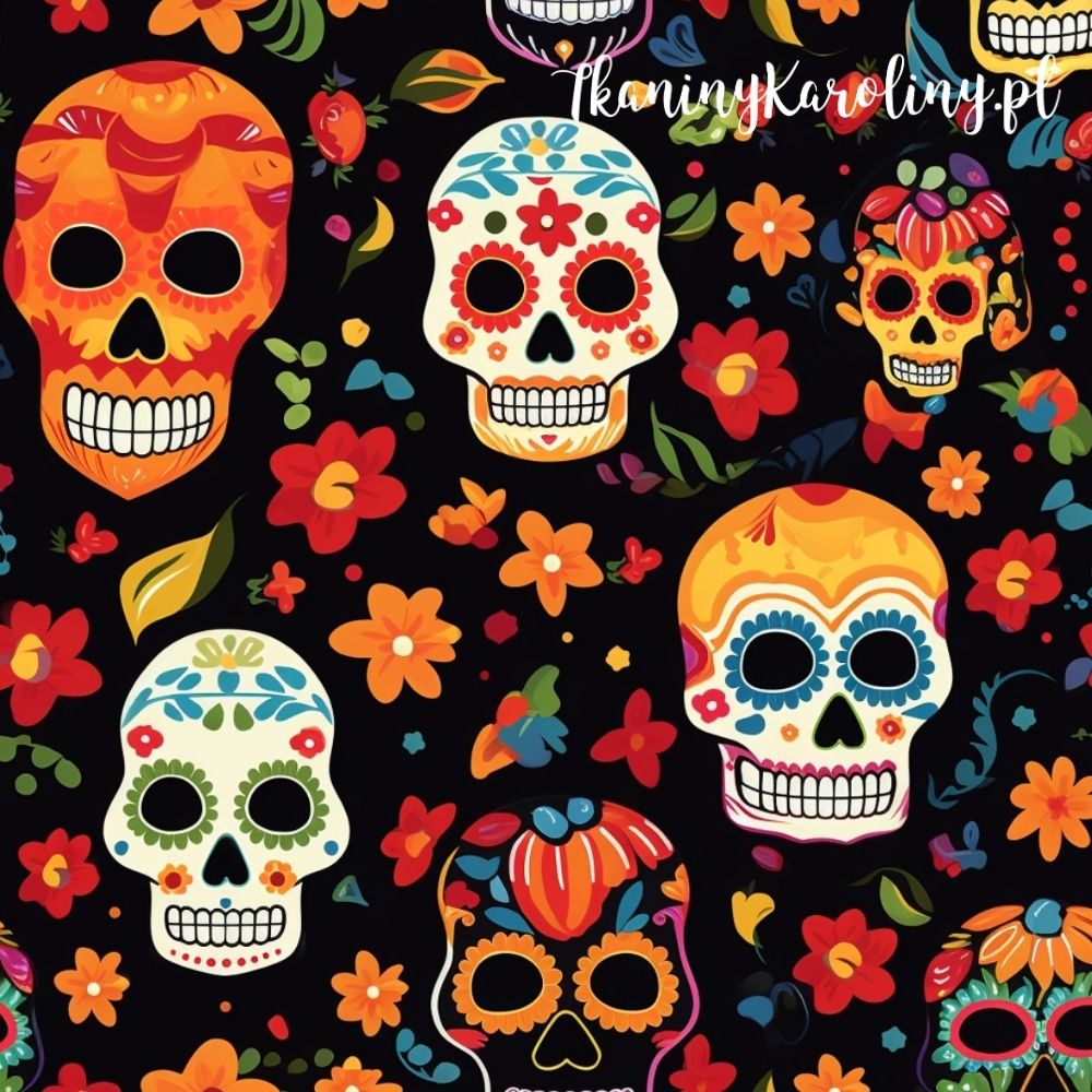 Czarne, pomarańczowe i białe czaszki w kwiatach na czarnym tle – elegancka i kolorowa mieszanka, jak bukiet, który postanowił być trochę figlarny, a trochę odważny.