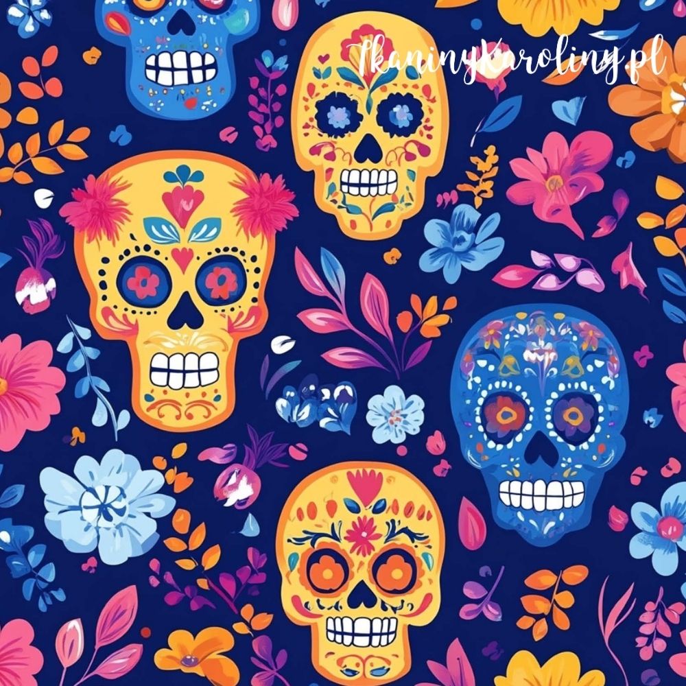 Żółte i niebieskie czaszki w towarzystwie niebieskich i różowych liści oraz kwiatów tworzą żywy, energetyczny wzór na ciemnogranatowym tle. Elegancka mieszanka grozy i koloru, idealna do tkanin pełnych charakteru.