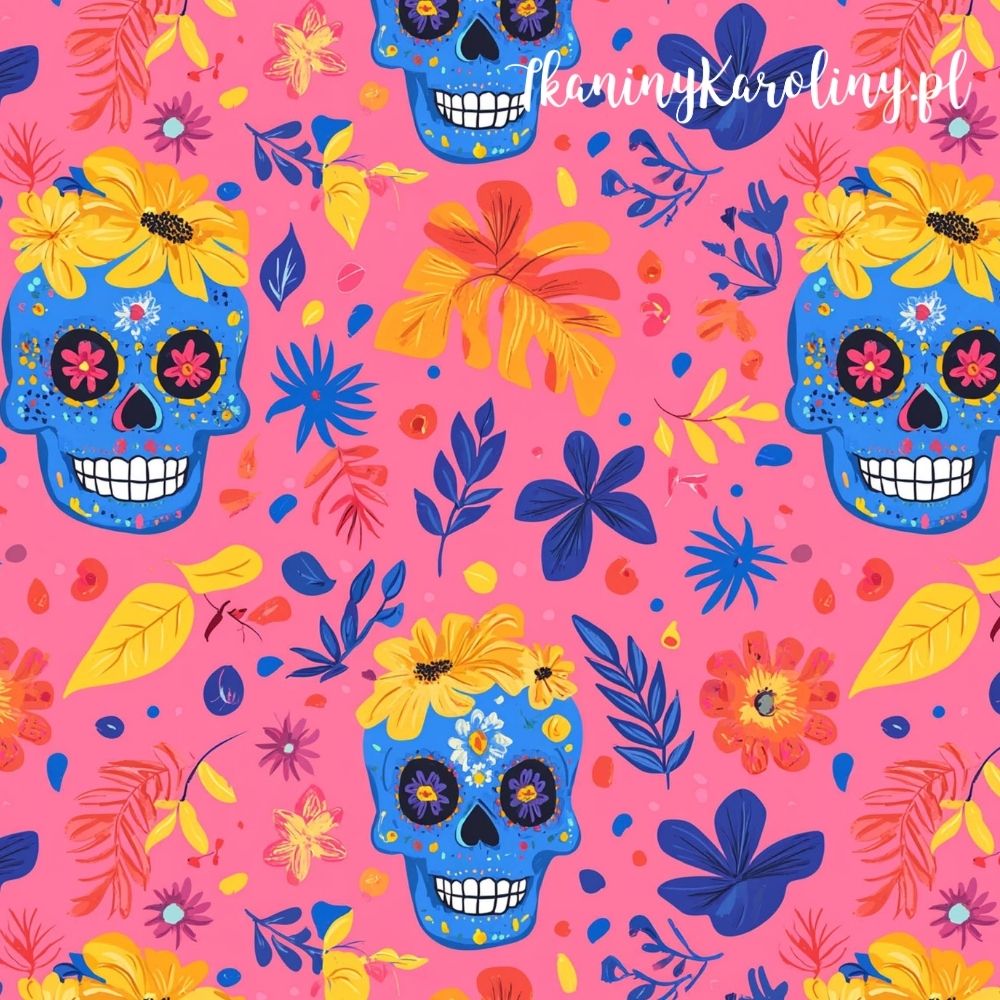 Granatowe czaszki w otoczeniu liści i kwiatów tańczą na ciemnoróżowym tle. Wzór pełen koloru i charakteru, łączący elegancję z wesołym, Día de los Muertos klimatem.