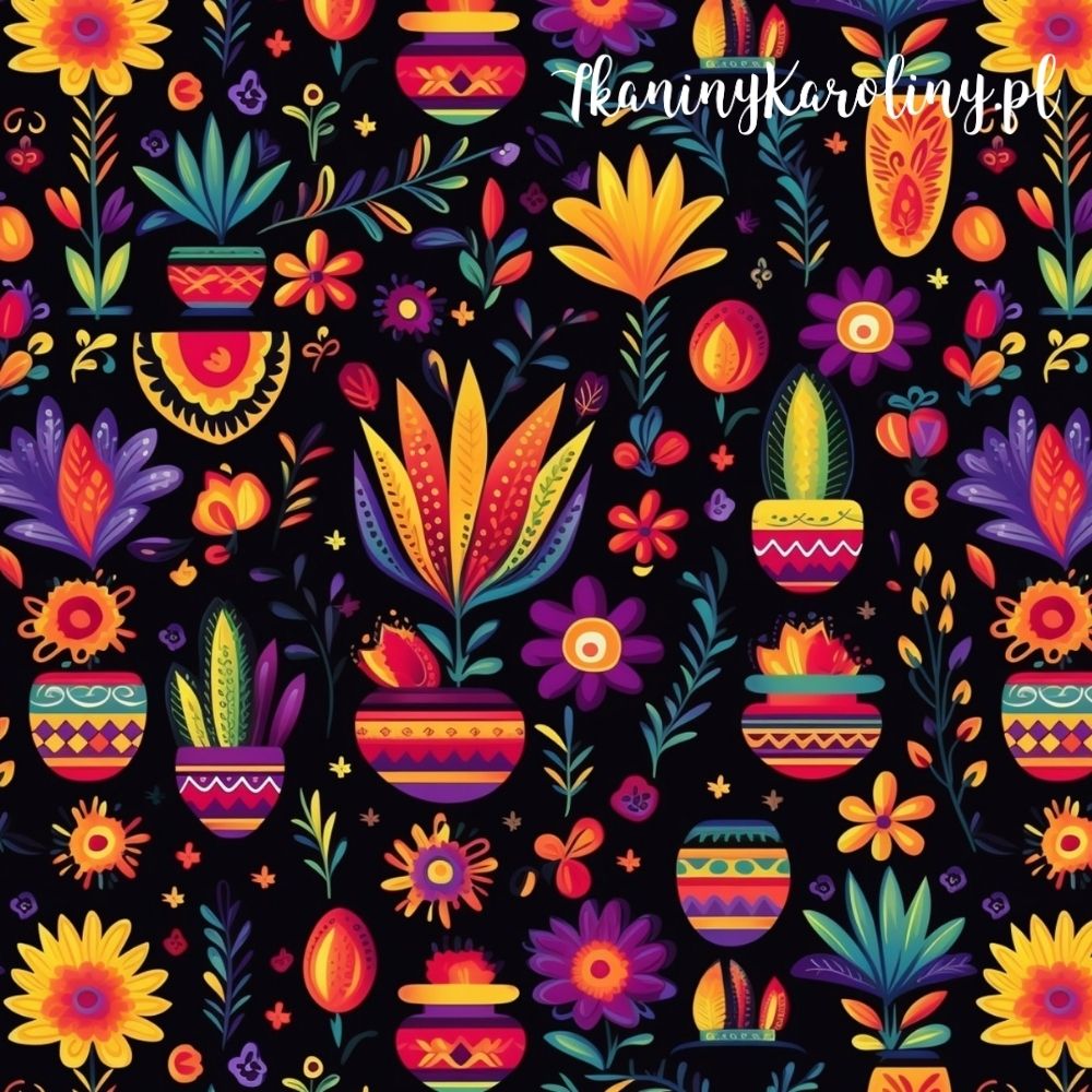 SOFTSHELL WODOODPORNY Halloween, Día de los Muertos - kolorowe doniczki na czarnym tle w kwiatach [6-8]