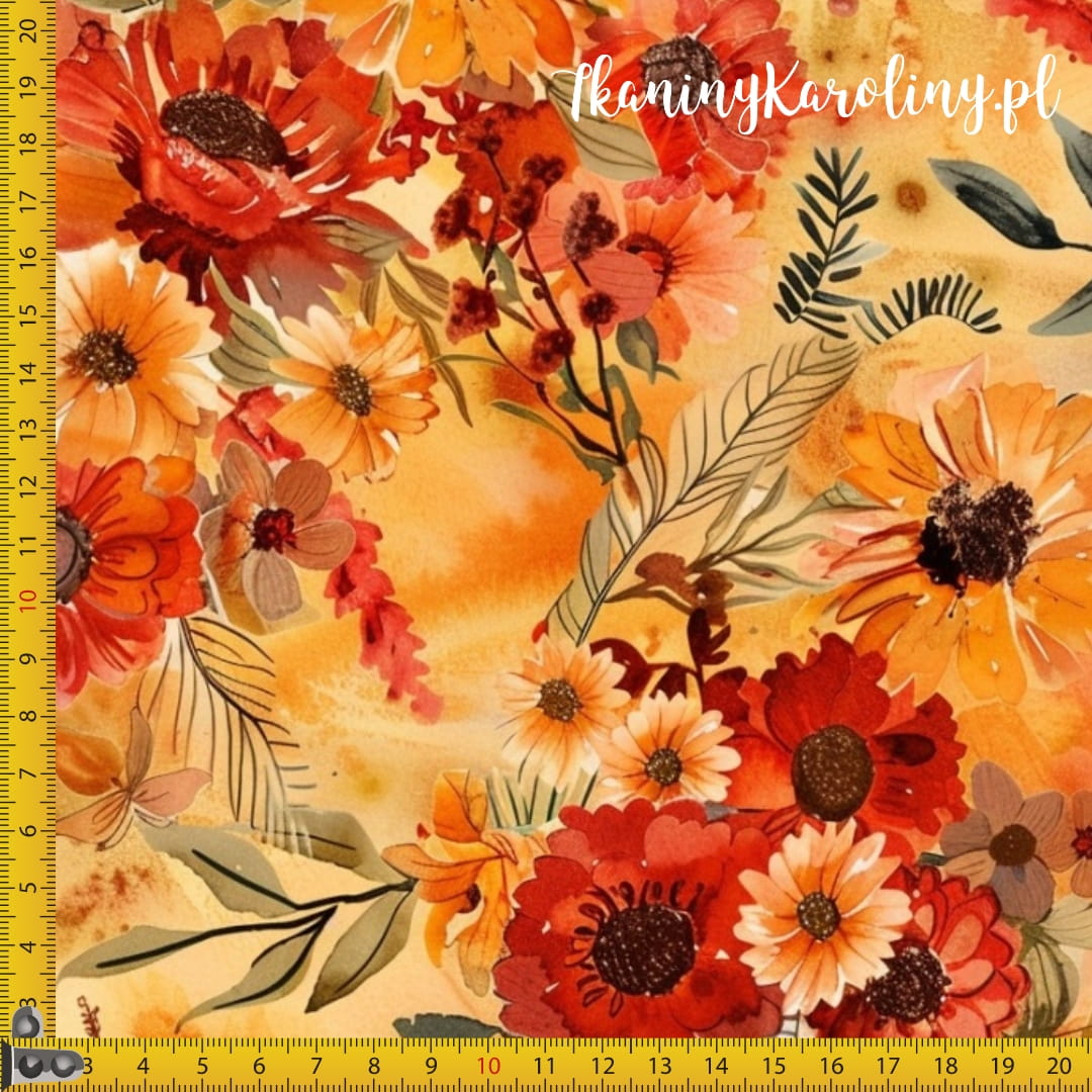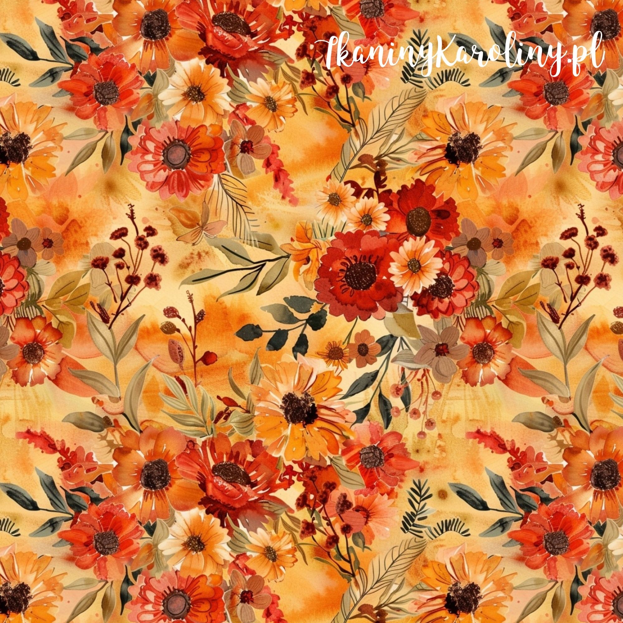 Wzór przedstawia jesienne kwiaty w pięknych ciepłych barwach. Na tkaninie wodoodpornej barwy są wyraźne i nasycone. Motyw tworzy ciepłą, jesienną kompozycję idealną do wnętrz i dodatków w stylu boho lub vintage.