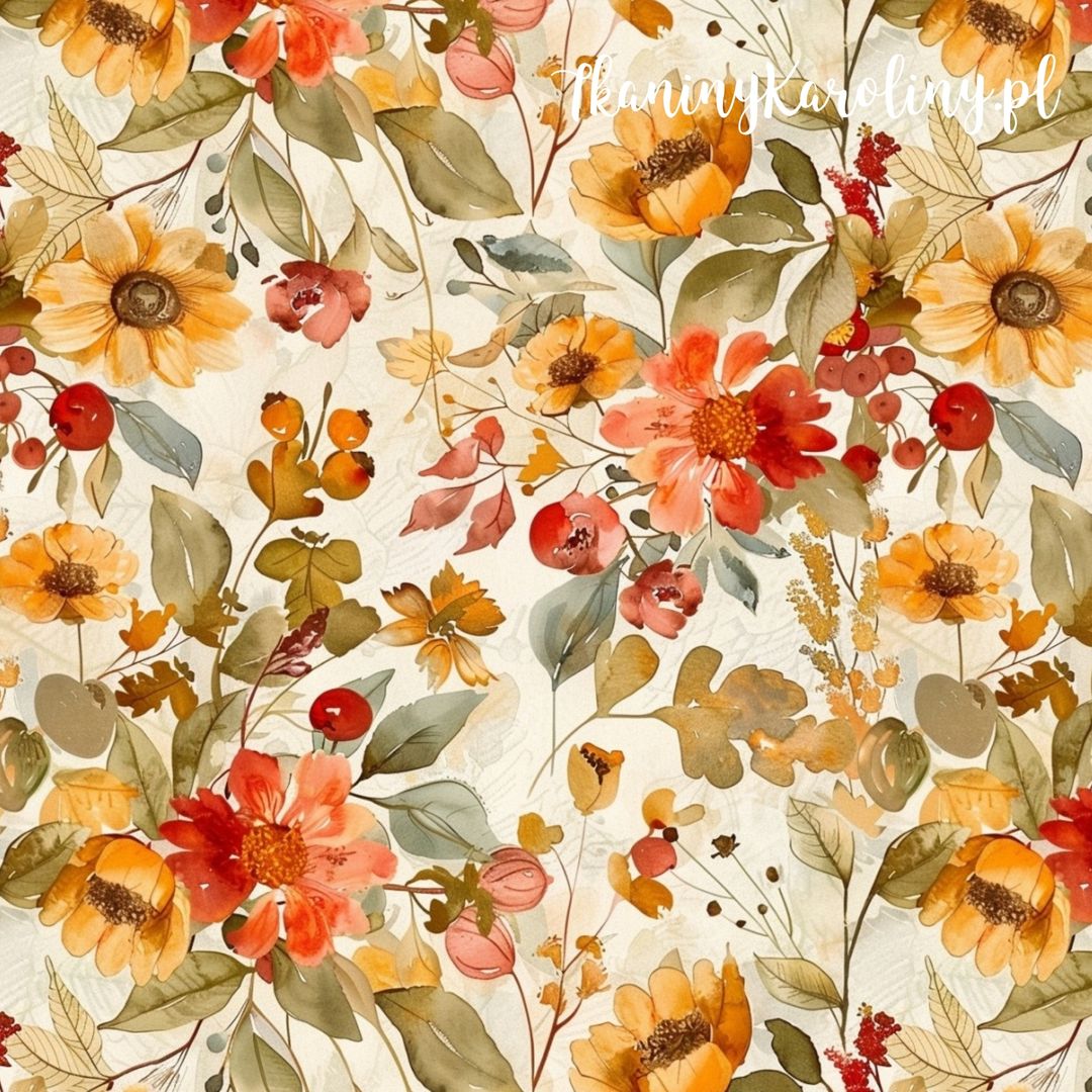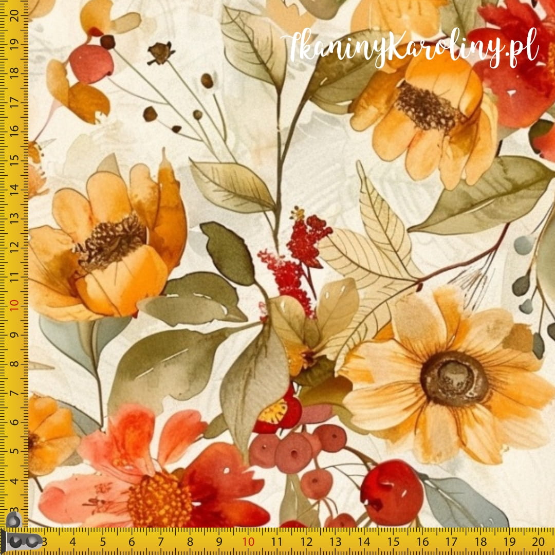 Wzór przedstawia jesienne kwiaty w pięknych ciepłych barwach. Na tkaninie wodoodpornej barwy są wyraźne i nasycone. Motyw tworzy ciepłą, jesienną kompozycję idealną do wnętrz i dodatków w stylu boho lub vintage.