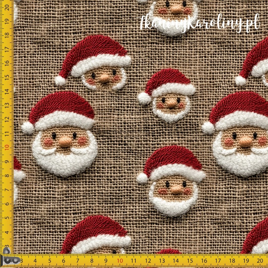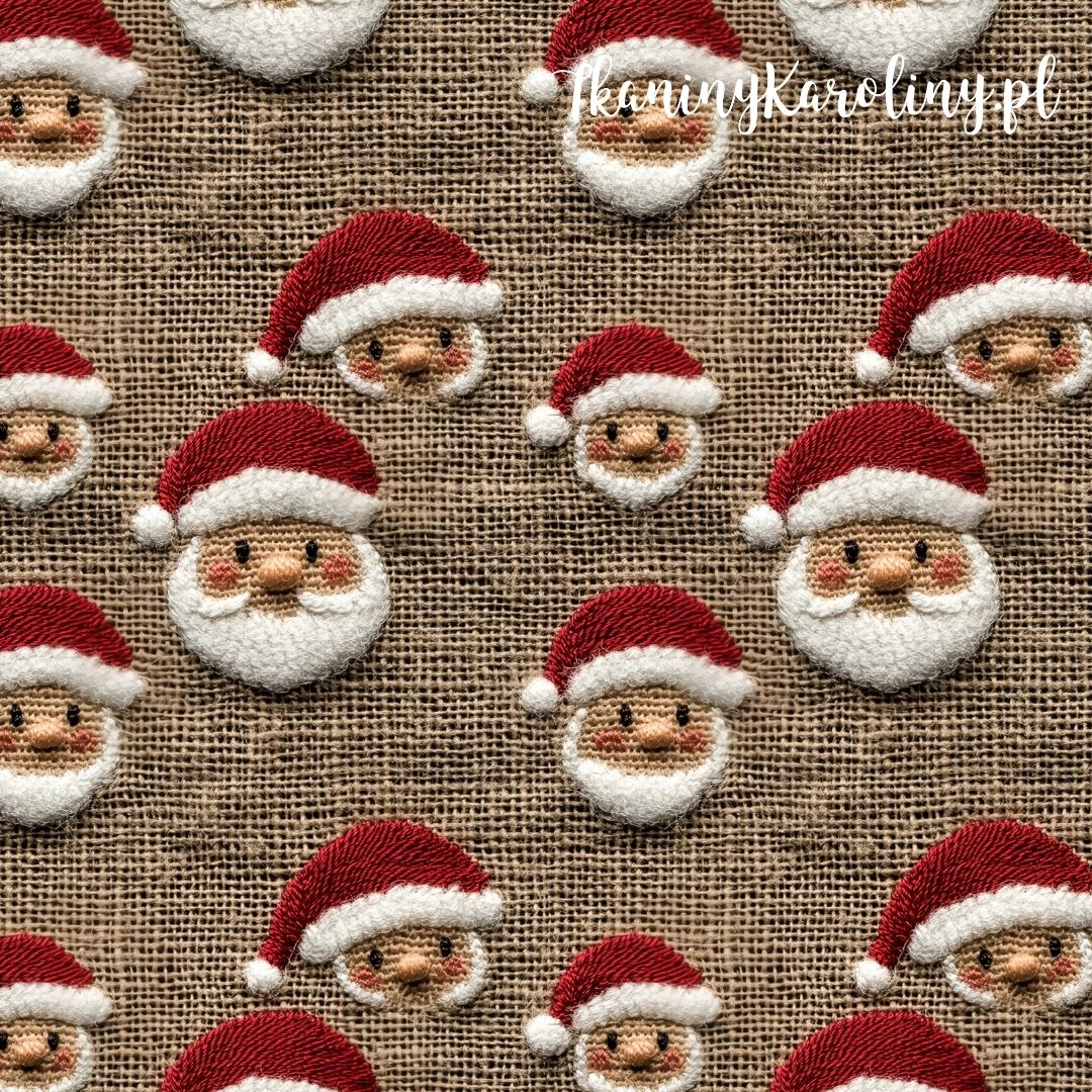 Święty Mikołaj na tle ciemnobeżowej juty w wersji softshell – materiał, który wygląda wyjątkowo, a jednocześnie chroni przed wiatrem i sprawdzi się w praktycznych projektach.