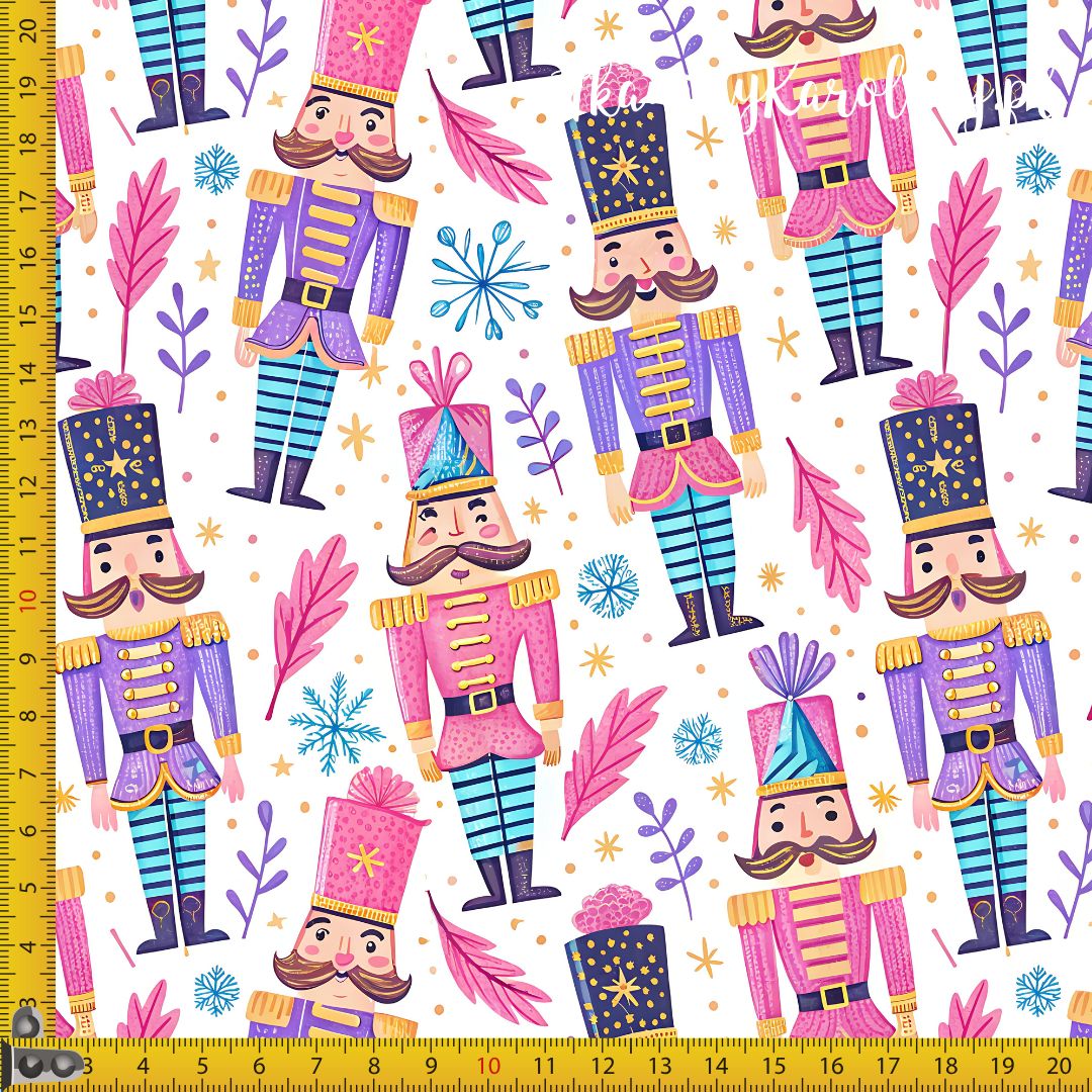 Kolorowe dziadki do orzechów w różowych i fioletowych uniformach, otoczone drobnymi gwiazdkami, płatkami śniegu i dekoracyjnymi liśćmi. Wzór jest radosny, bajkowy i pełen świątecznego uroku – idealny na tkaniny dekoracyjne, świąteczne czy akcesoria dla dzieci. Wspaniale sprawdzi się na śpiworkach i mufkach do wózków na zimę :)