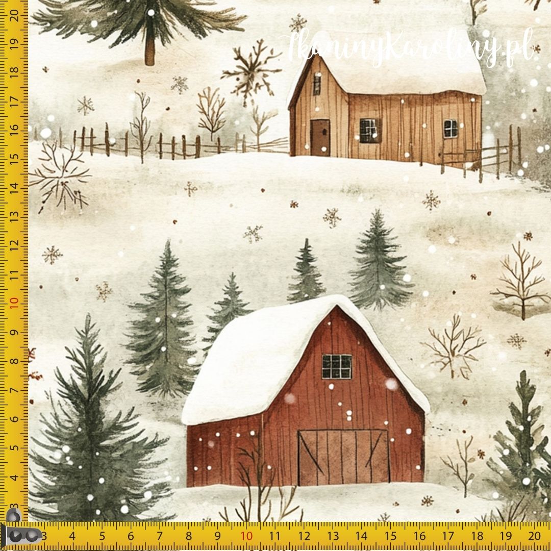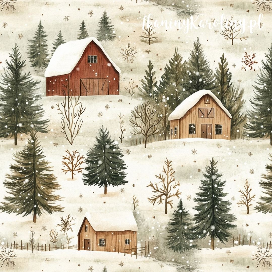 SOFTSHELL WODOODPORNY Wzory świąteczne - brązowe i beżowe chatki na śniegu (jasne tło) [6-8]