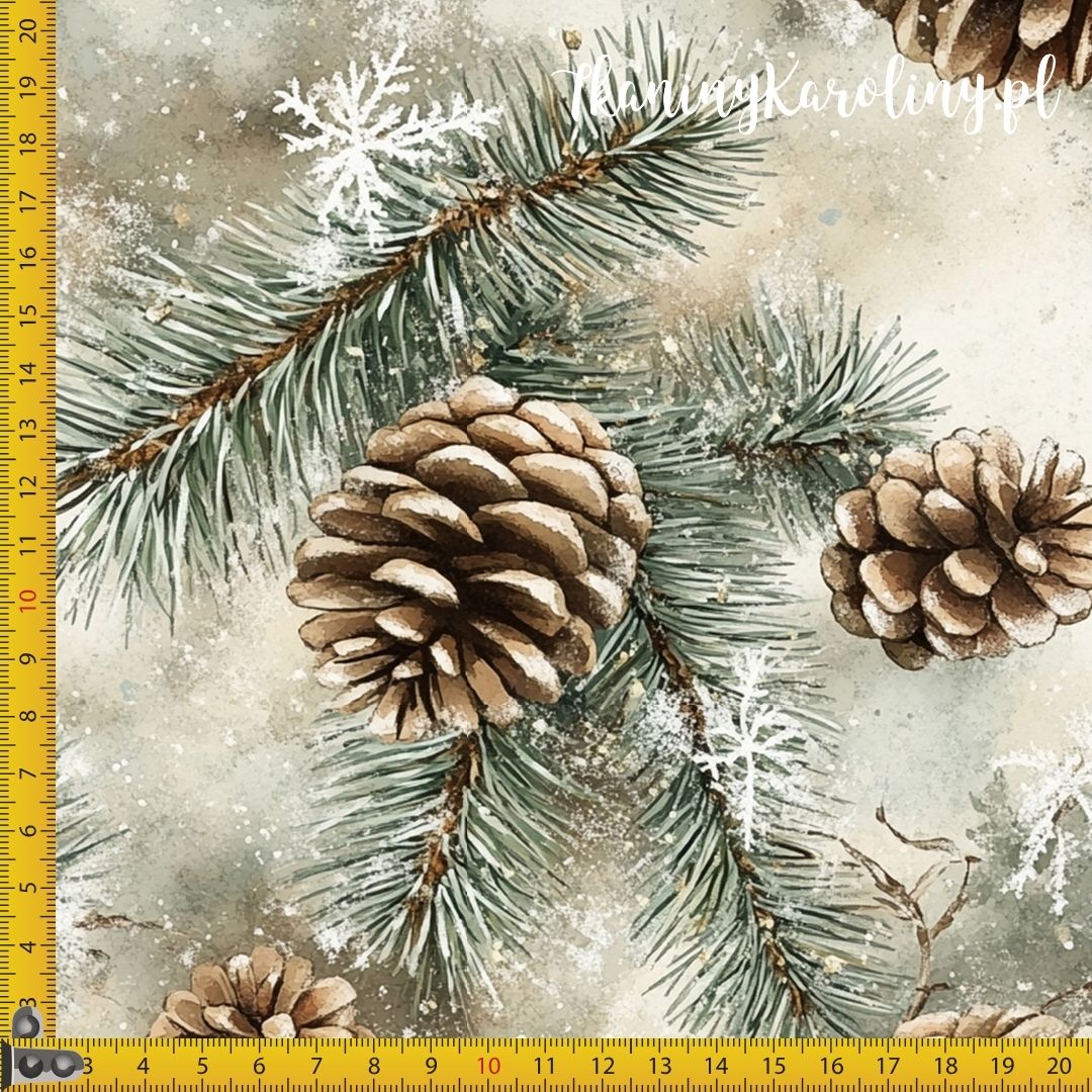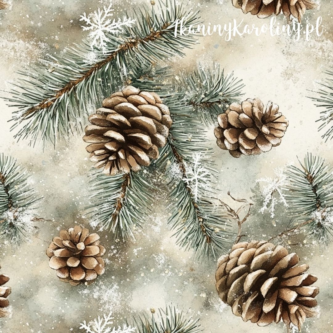 SOFTSHELL WODOODPORNY Wzory świąteczne - szyszki w gałązkach iglastych, jasne tło