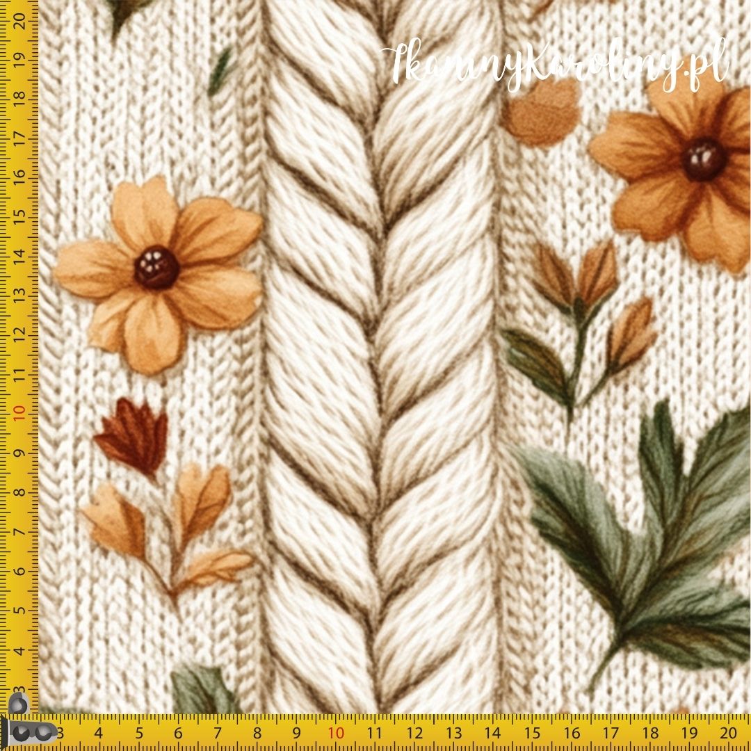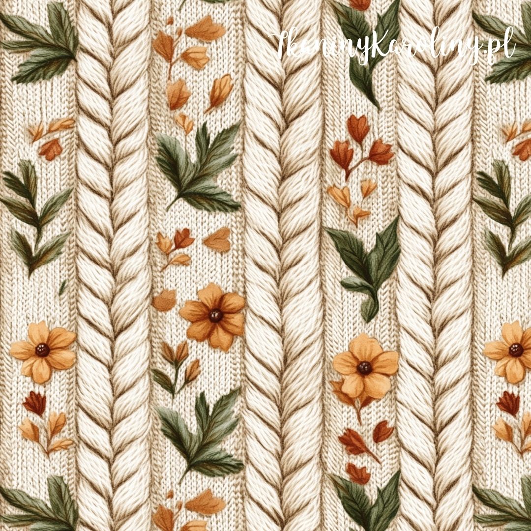 Przytulny wzór jak z ciepłego swetra – kremowe sploty przeplatają się z kwiatami i zielenią, tworząc rustykalny, jesienno-zimowy klimat pełen uroku.