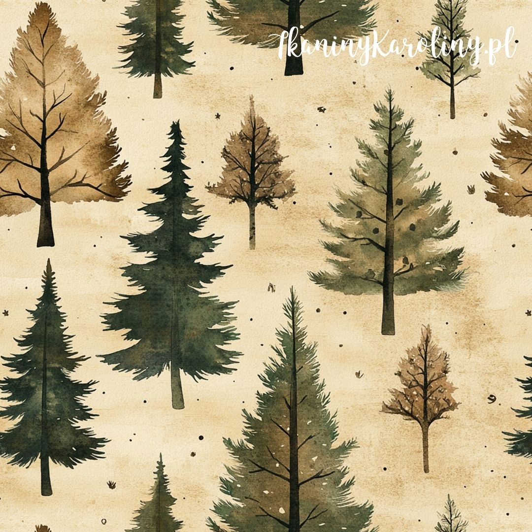 Zielone choinki na beżowym tle – klasyczny, świąteczny wzór o ciepłym charakterze.
