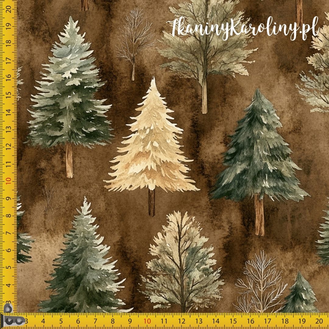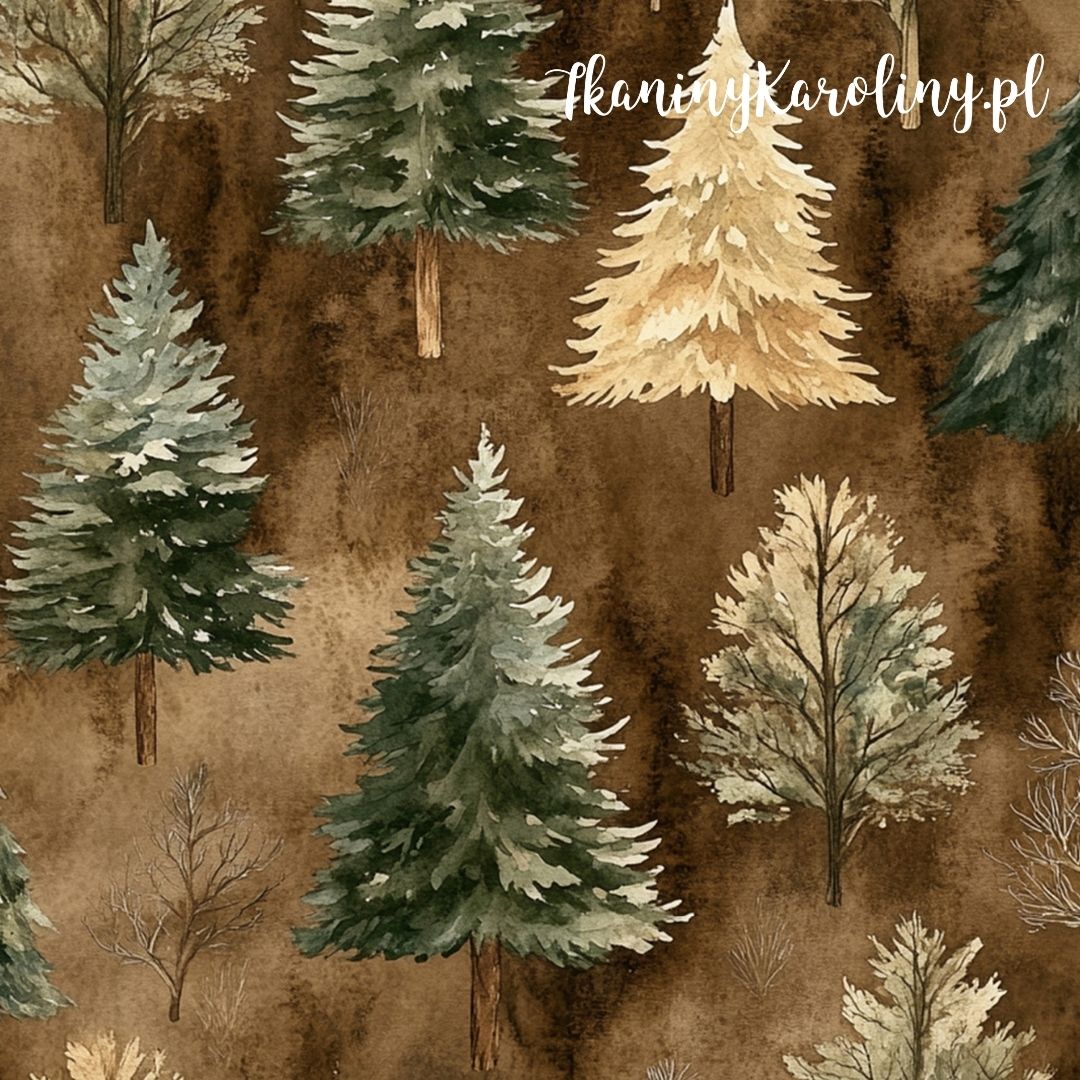 Zielone choinki na brązowym tle – klasyczny, świąteczny wzór o ciepłym charakterze.