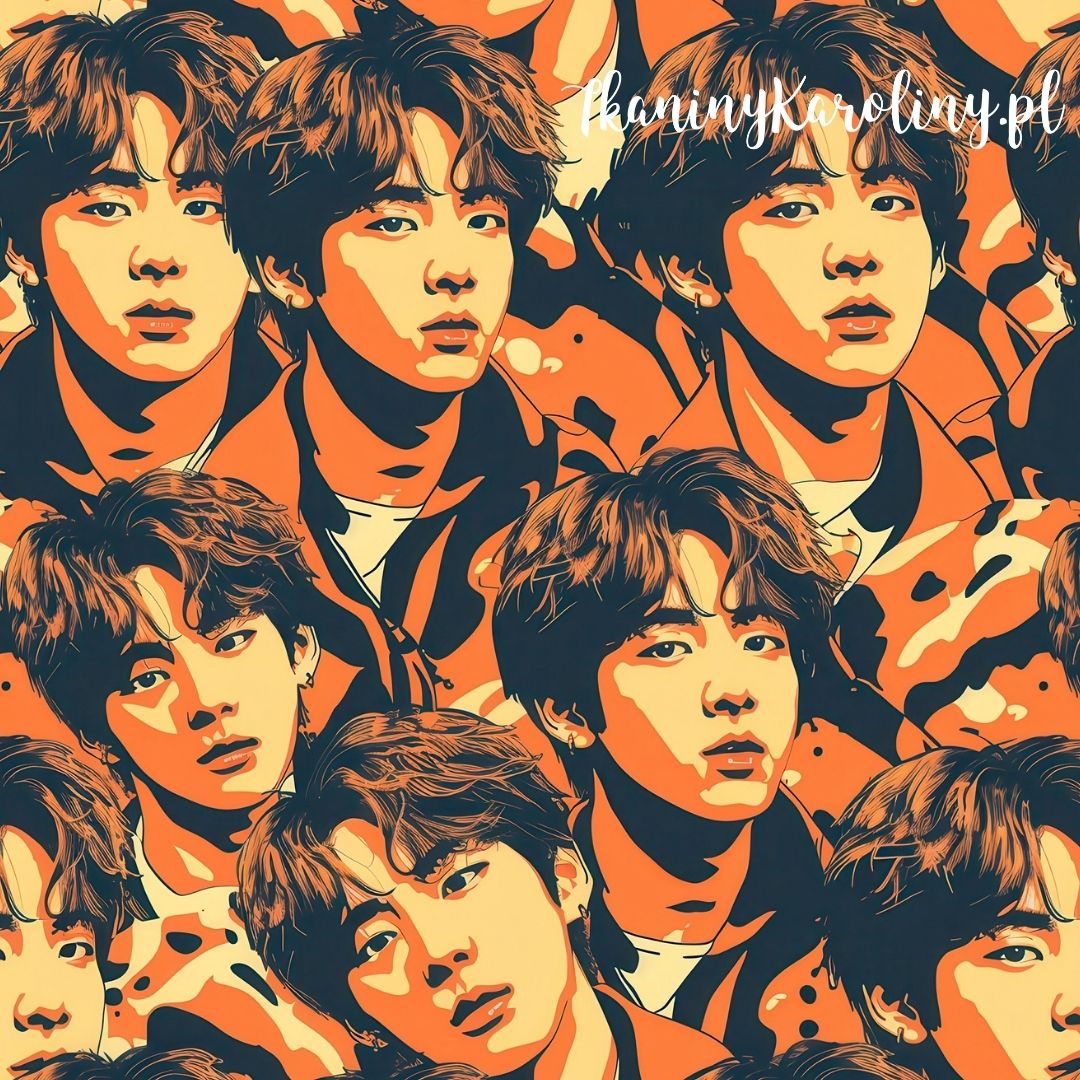 Młodzieżowy, energetyczny, portretowy wzór K-POP – twarze chłopców w odcieniach czerni i pomarańczu.
