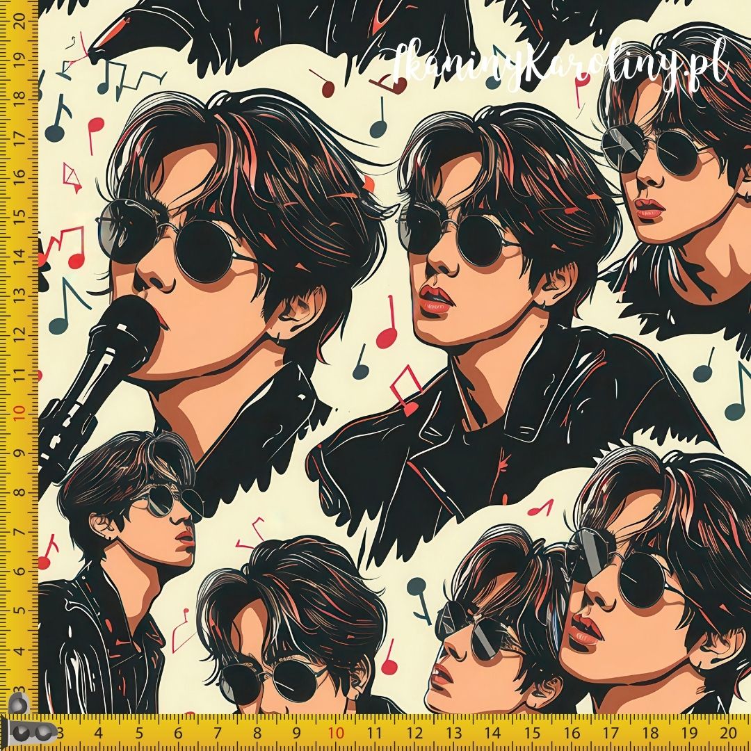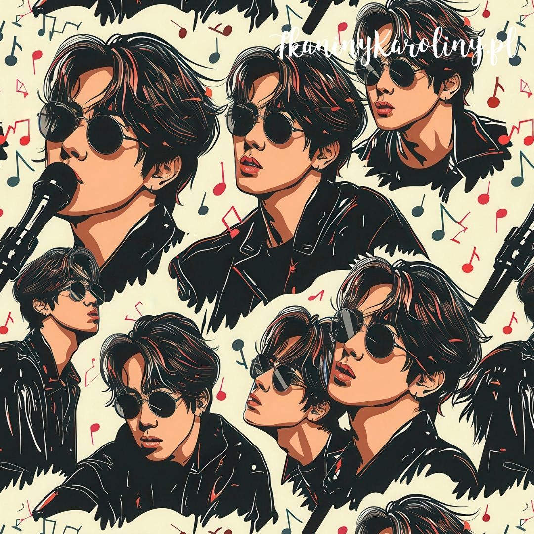 Sylwetki chłopców K-POP w okularach przeciwsłonecznych i czarnych kurtkach. Wzór urozmaicony mikrofonami i nutami a całość widnieje na jasnym tle.