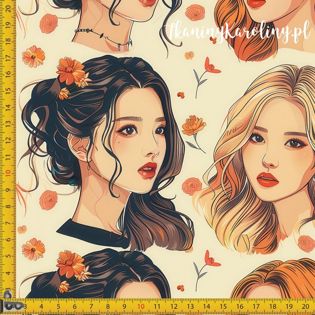 TKANINA WODOODPORNA OXFORD K-POP Dziewczyny, portrety w pomarańczowych kwiatach jasnym tle [6-8]