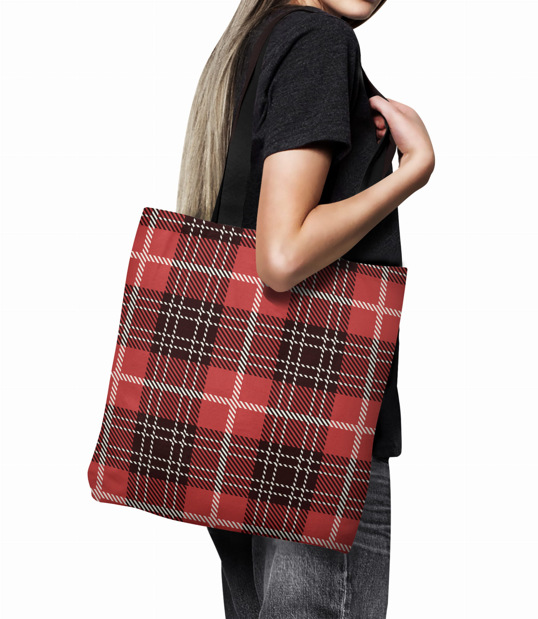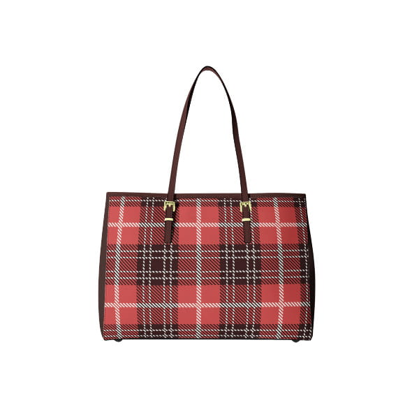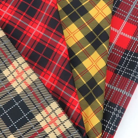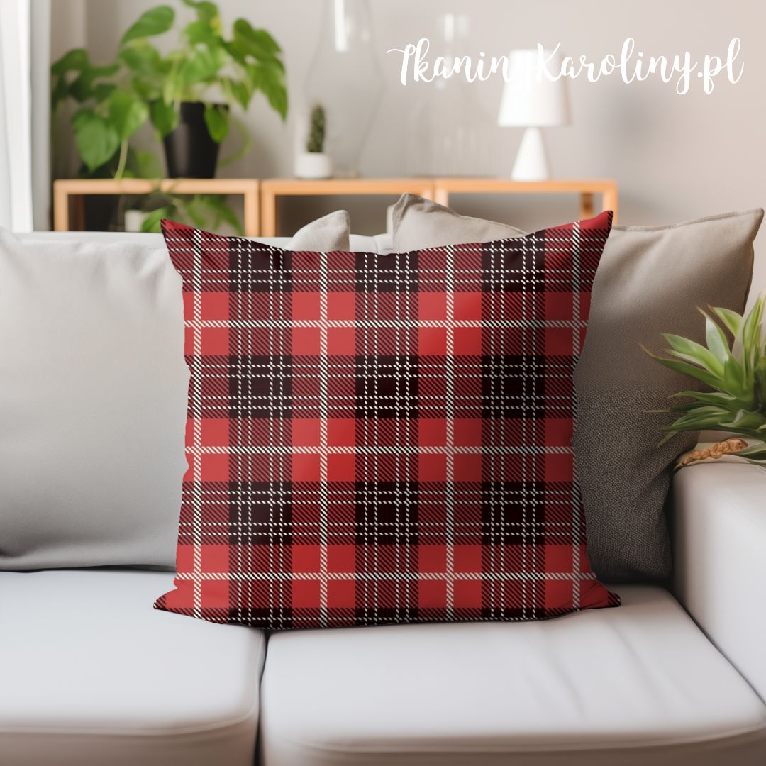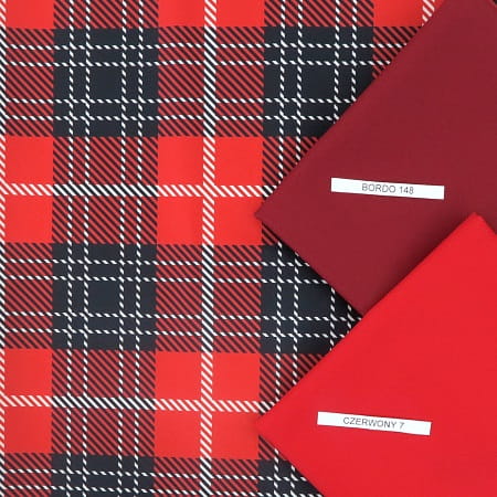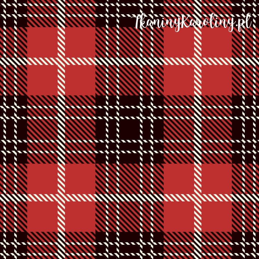 Tkanina o wzorze kraty w ciepłej, wyrazistej kolorystyce. Dominują barwy czerwień i czerń przełamane nutką bieli, które tworzą regularny układ kwadratów i pasów, przypominający klasyczny tartan szkocki.