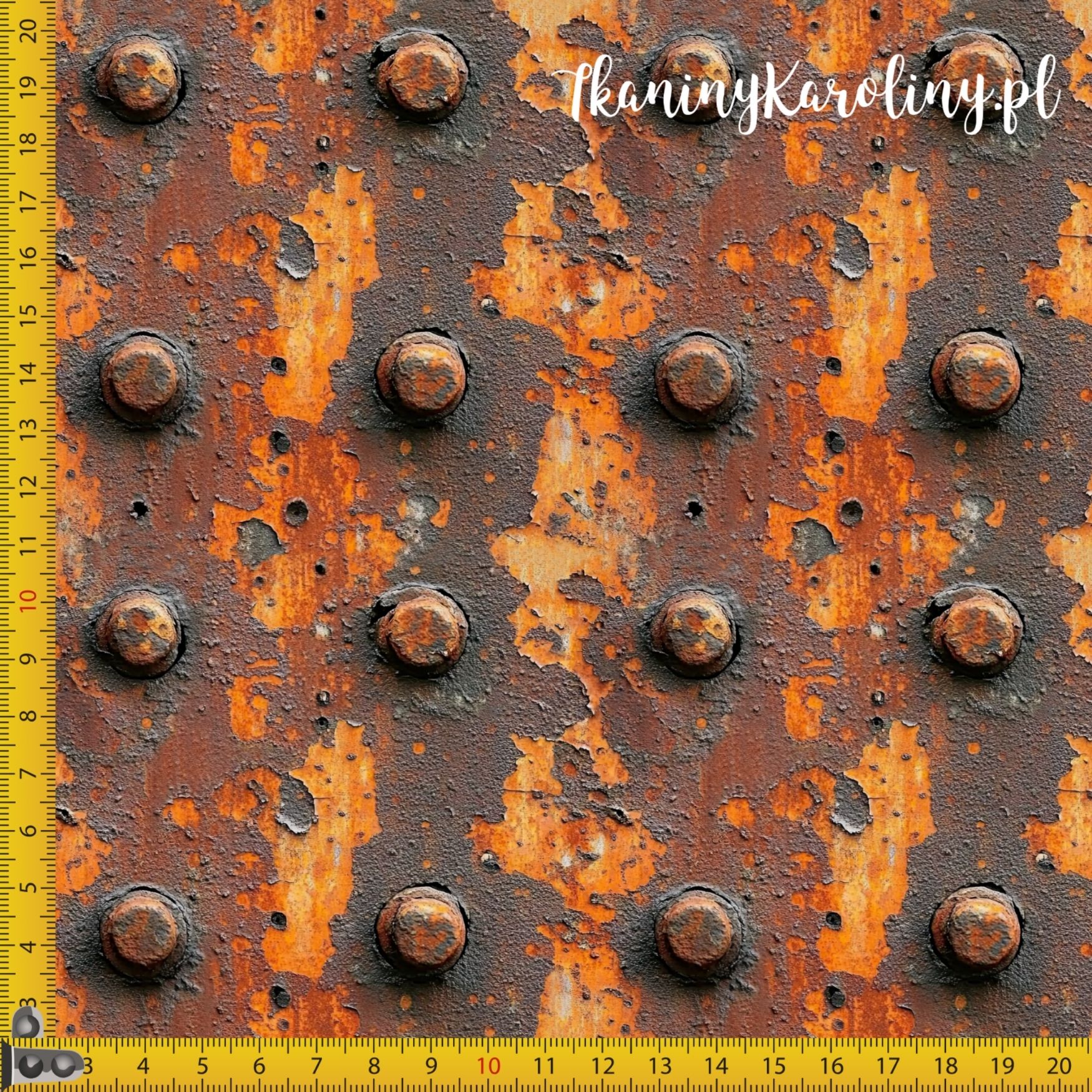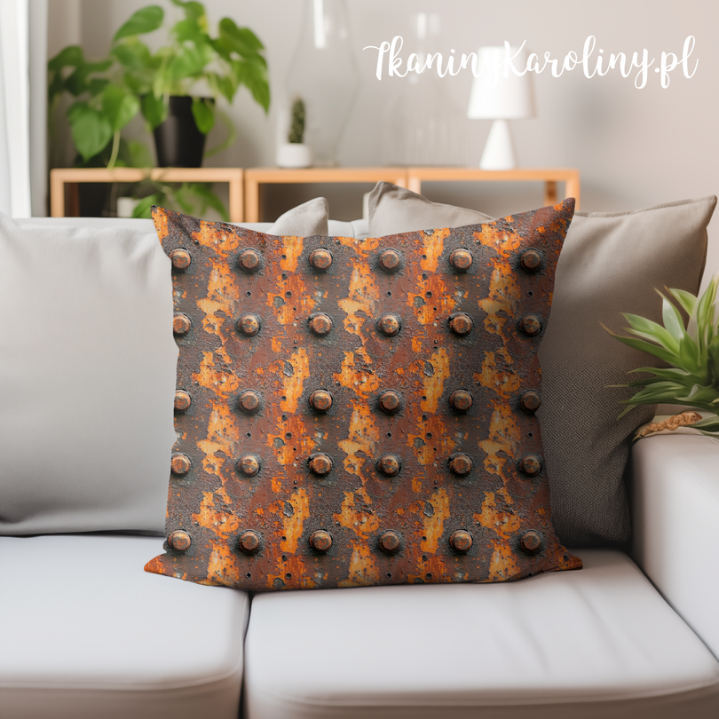 Wyrazisty wzór inspirowany postarzaną, stalową powierzchnią z widocznymi nitami i śladami intensywnego zużycia. Motyw przedstawia rdzawy metal z łuszczącą się farbą i nieregularną fakturą, w której dominują ciepłe odcienie rdzy, pomarańczy oraz ciemnych brązów przełamane grafitową szarością.