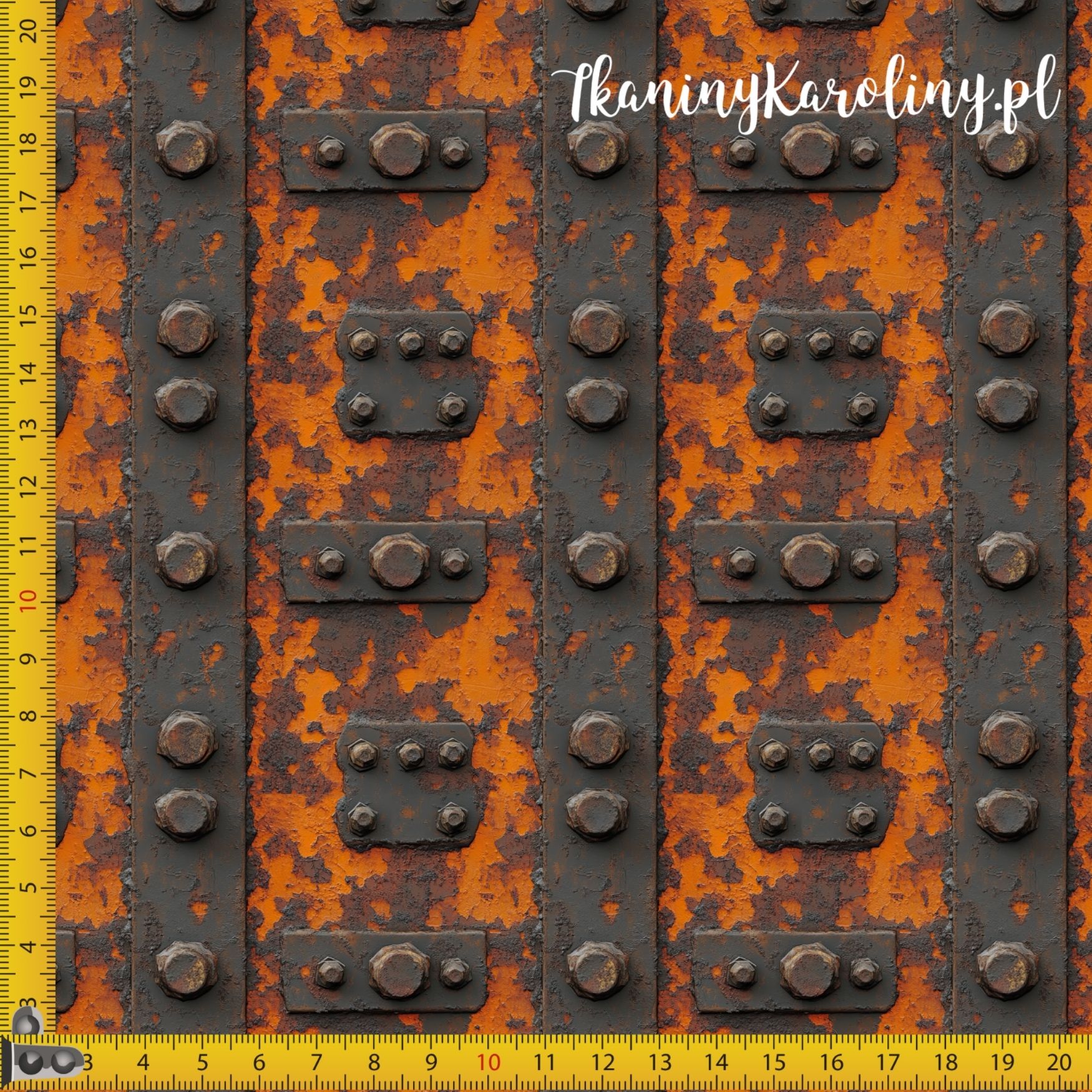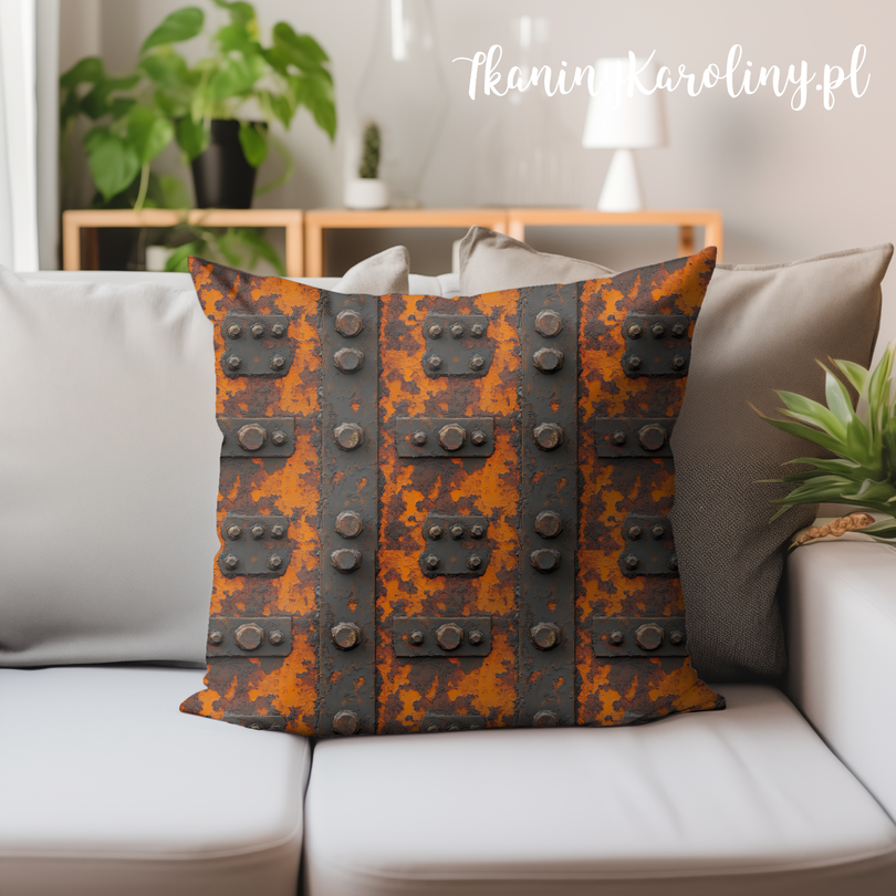Wyrazisty, industrialny wzór inspirowany masywną, stalową konstrukcją pokrytą rdzą i patyną czasu. Motyw przedstawia fragmenty metalowych płyt łączonych grubymi nitami i śrubami, z wyraźnie widoczną, łuszczącą się farbą w intensywnych odcieniach rdzawo-pomarańczowych, grafitowych i ciemnobrązowych.