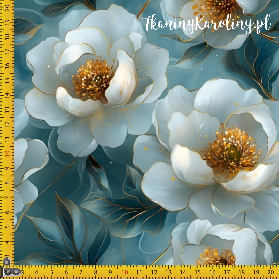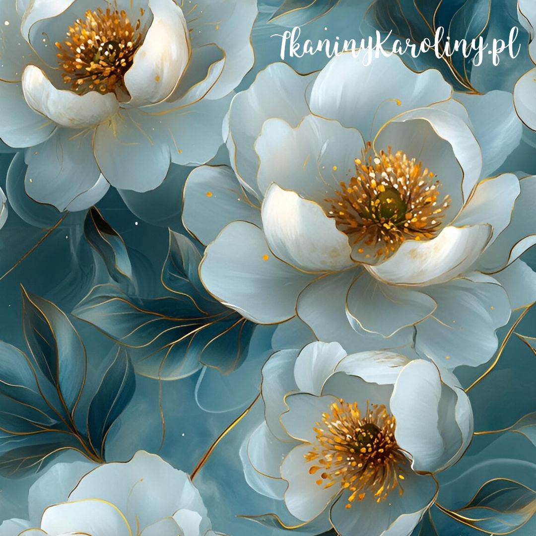Delikatny, malarski wzór z kwiatami peonie i złotymi akcentami na morskim tle.