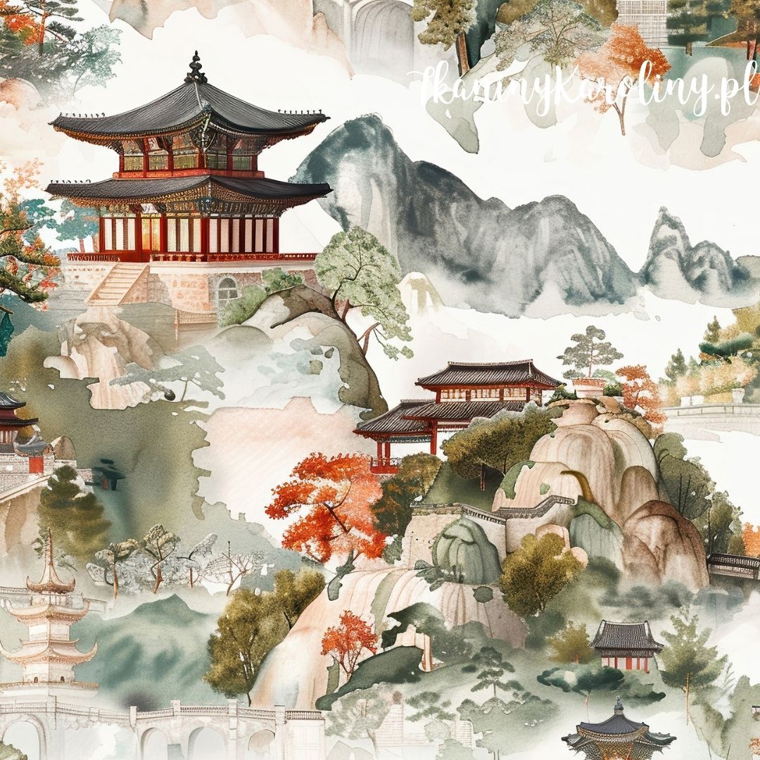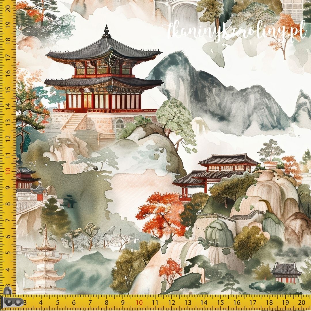 TKANINA WODOODPORNA OXFORD Wzór orientalny, świątynia w górach (brązowa) [6-8]