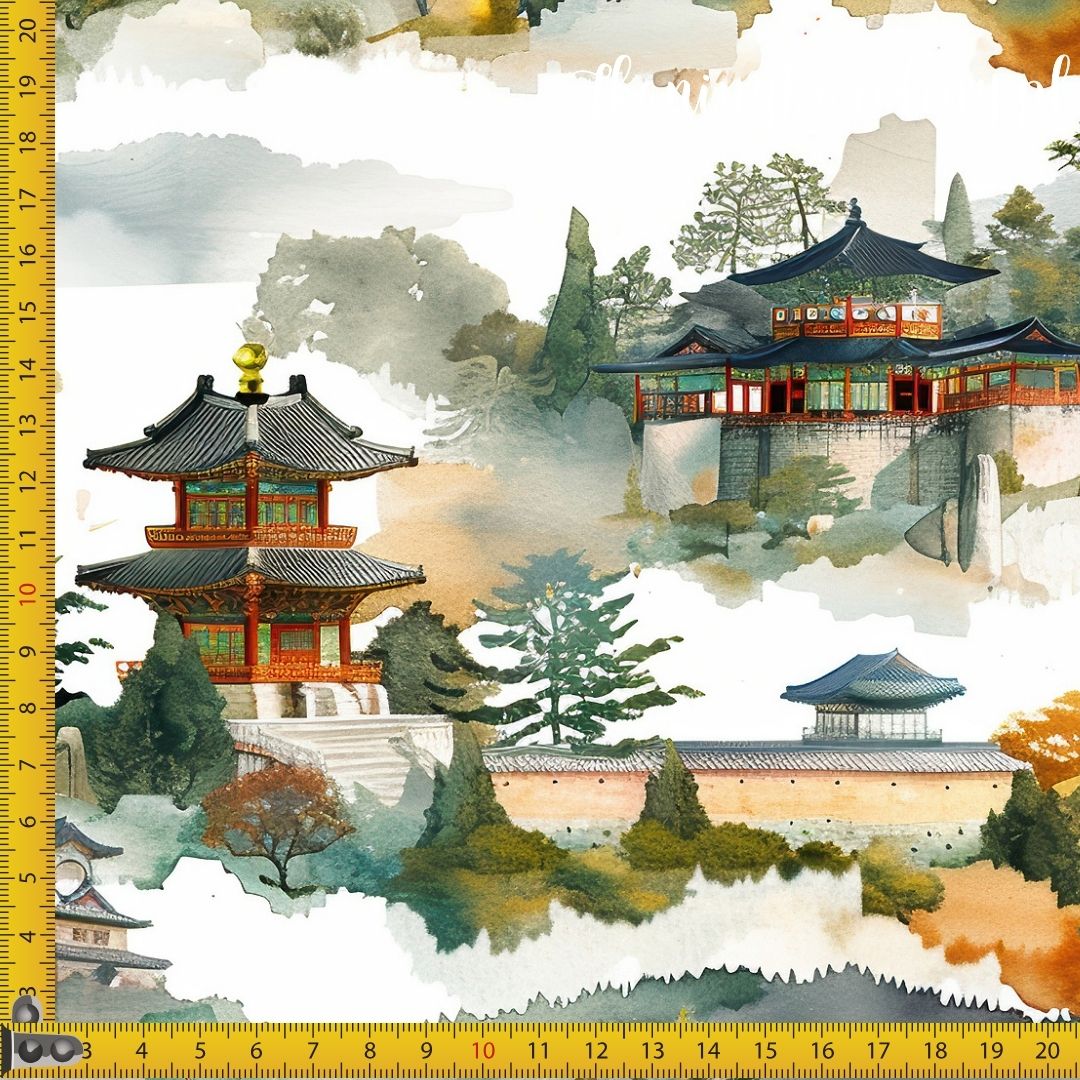 TKANINA WODOODPORNA OXFORD Wzór orientalny, świątynia w górach (szarozielona) [6-8]