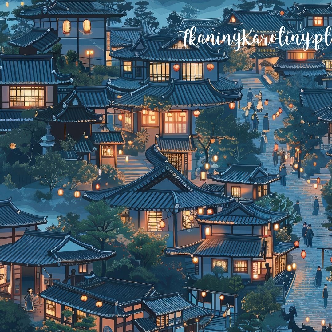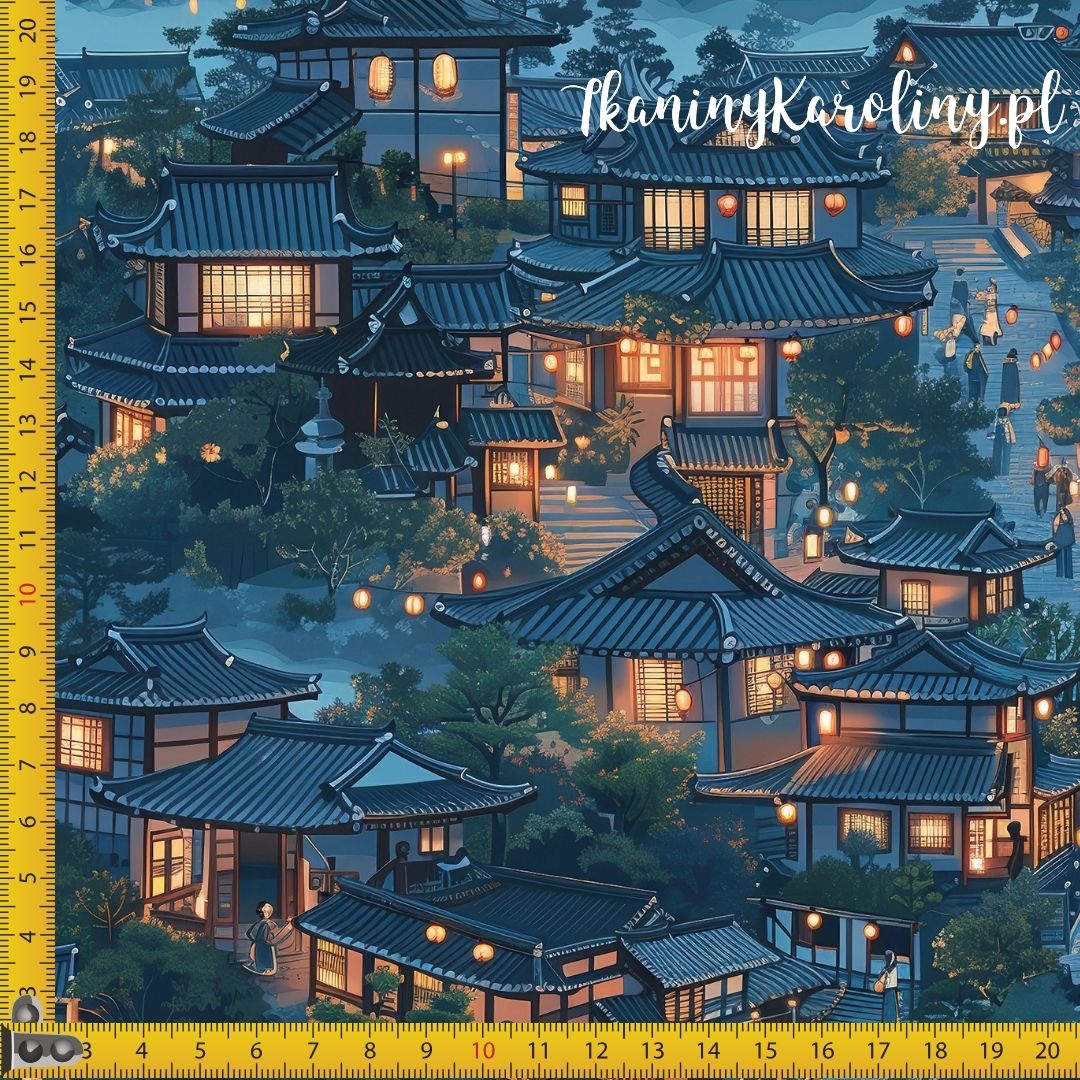 TKANINA WODOODPORNA OXFORD Wzór orientalny, wioska nocą (niebieska) [6-8]