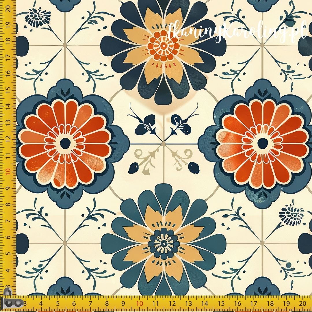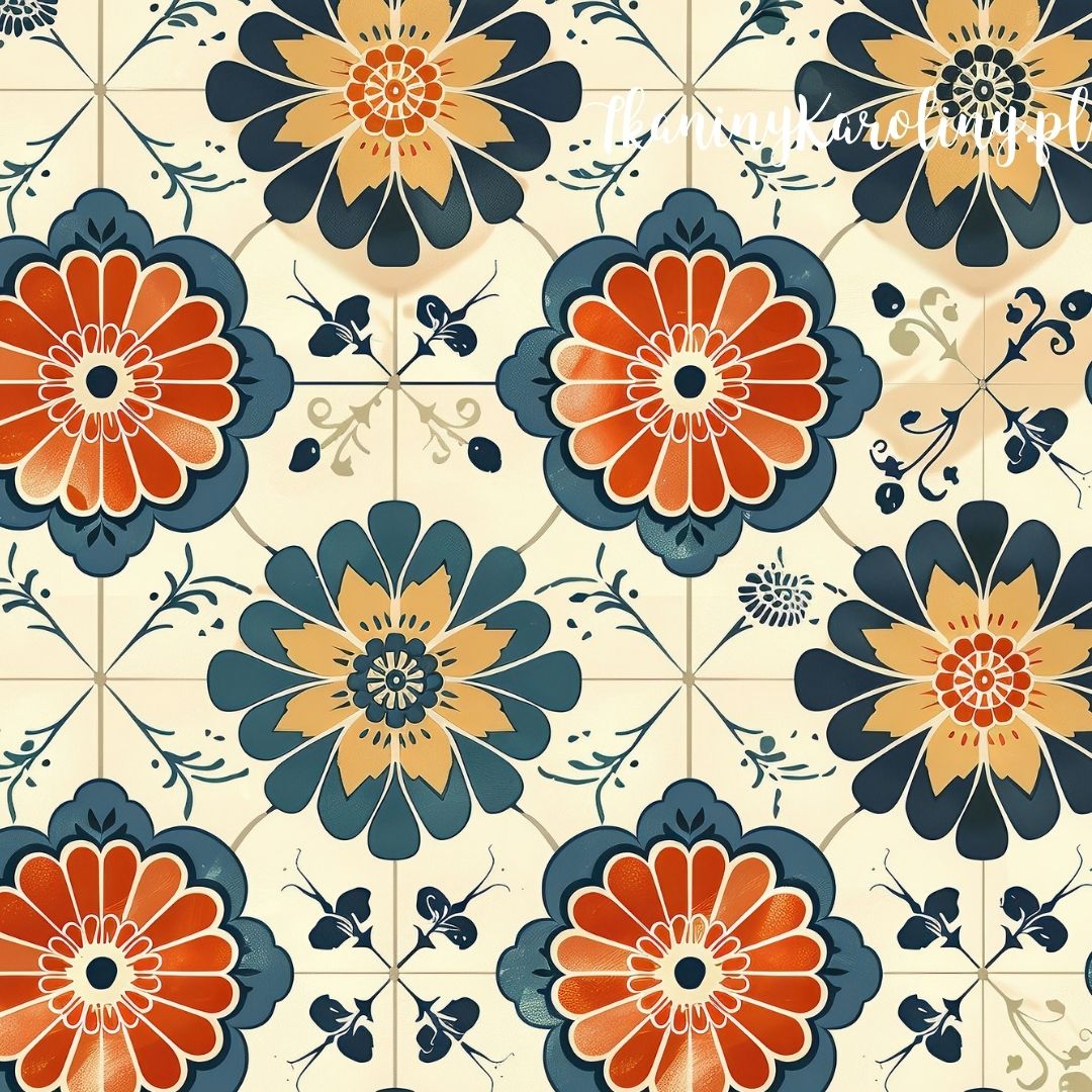 Jasne tło z dużymi, stylizowanymi kwiatami przypominającymi promienie słońca. Kolory to ciepły pomarańcz, granat i piaskowy beż. Wzór lekko rustykalny, nieco orientalny, przywodzący na myśl płytki z lat 70.