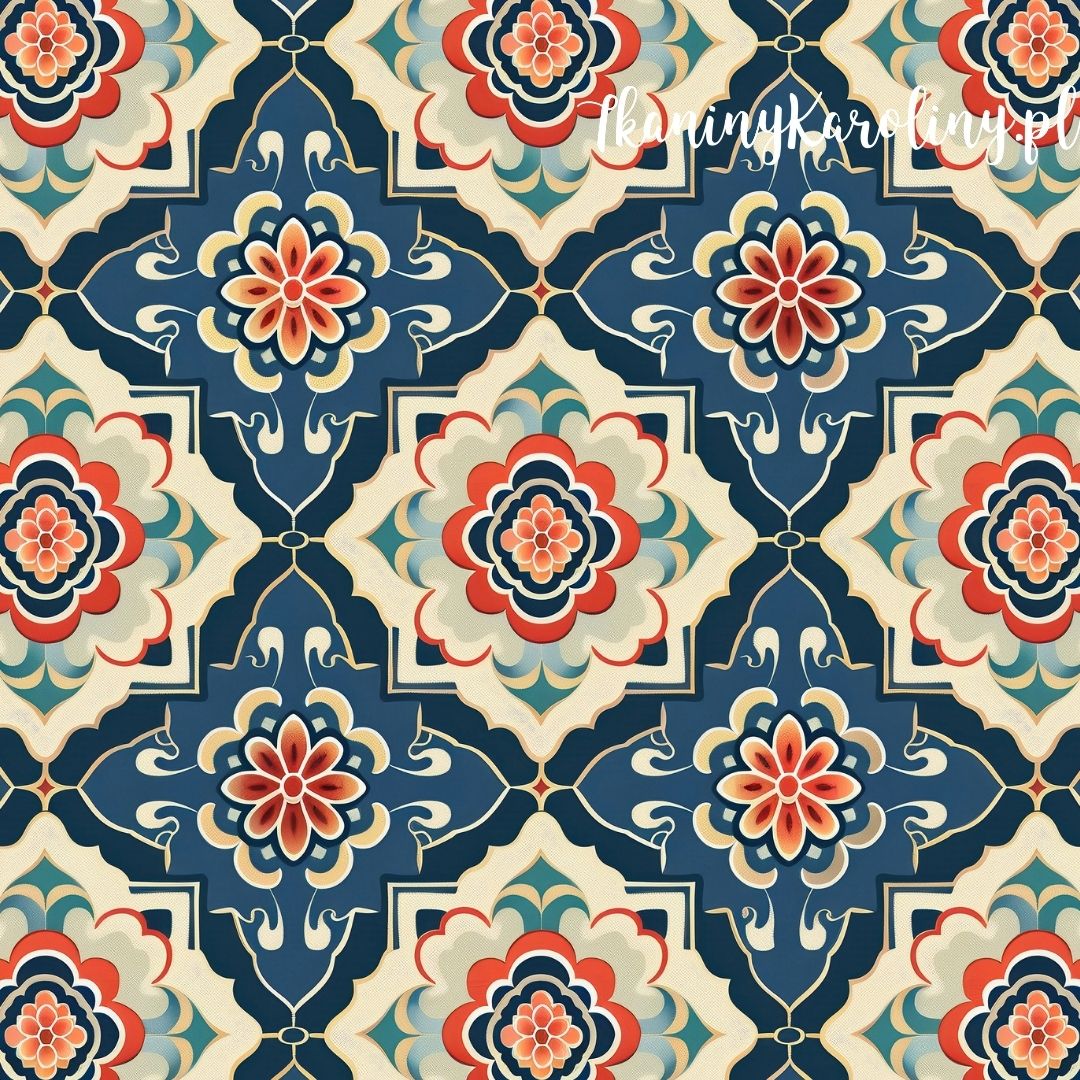 Bogaty, wielowarstwowy wzór wypełniony geometryczno-kwiatowymi kształtami.