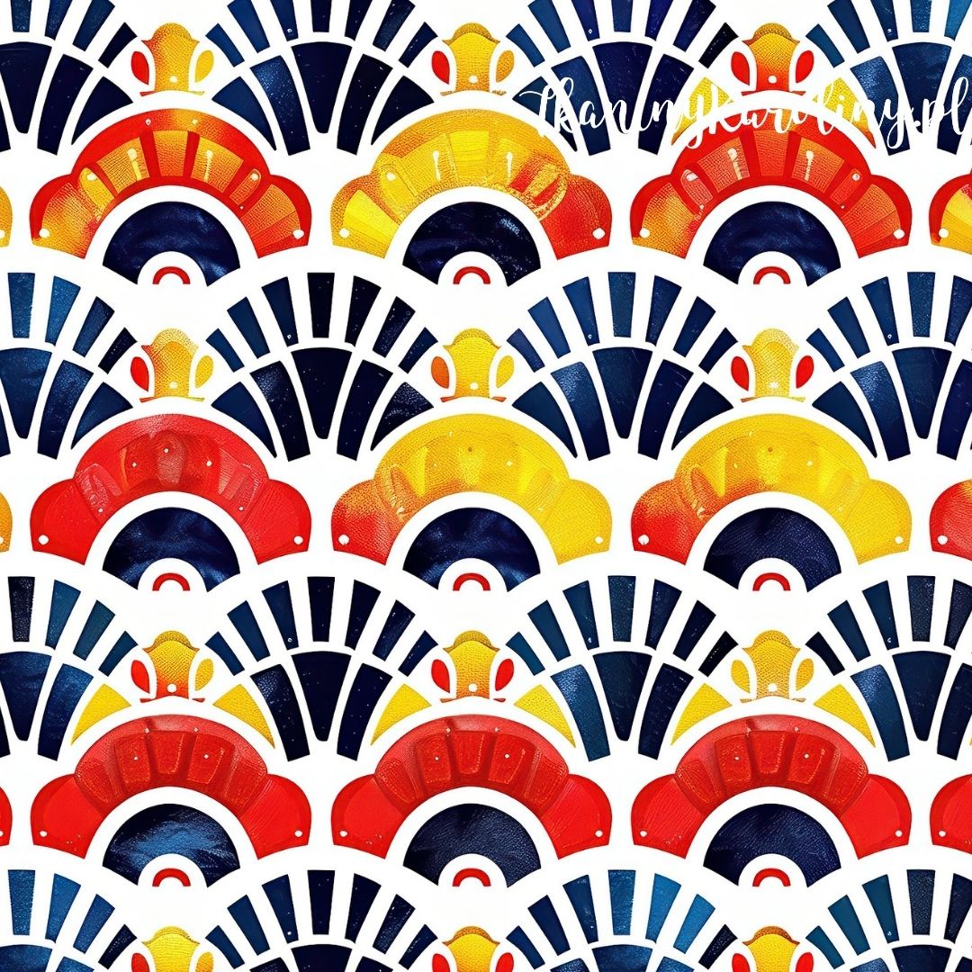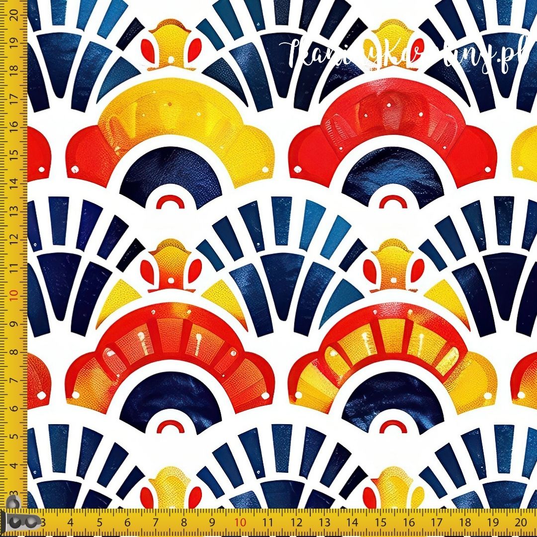 Piękny, energetyczny wzór wachlarzy w pomarańczu i granacie na jasnym tle.