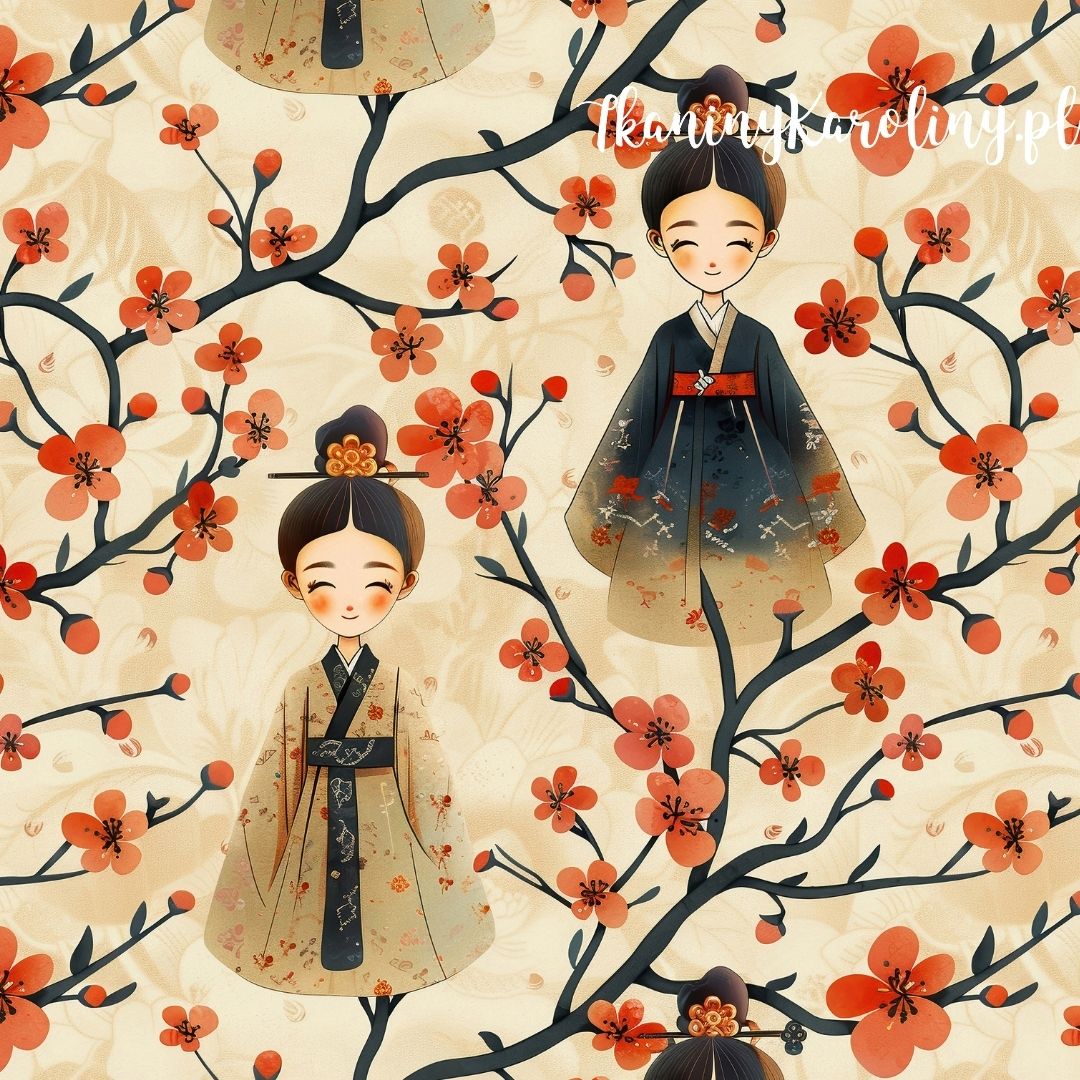 Śliczne laleczki w stylu orientalnym na beżowym tle z kwiatami wiśni.