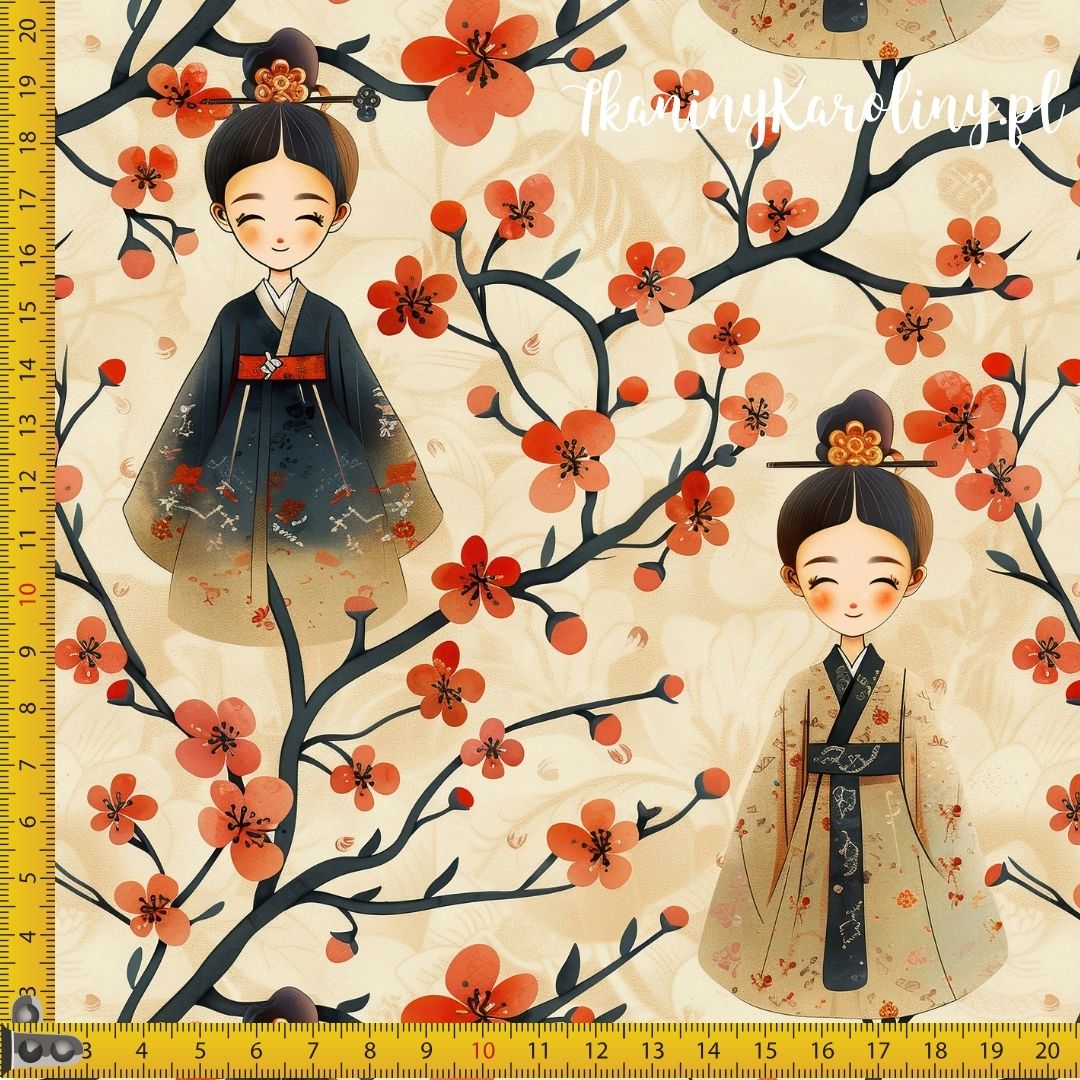 TKANINA WODOODPORNA OXFORD Wzory orientalne - Laleczki w kwiatach wiśni na beżu [6-8]