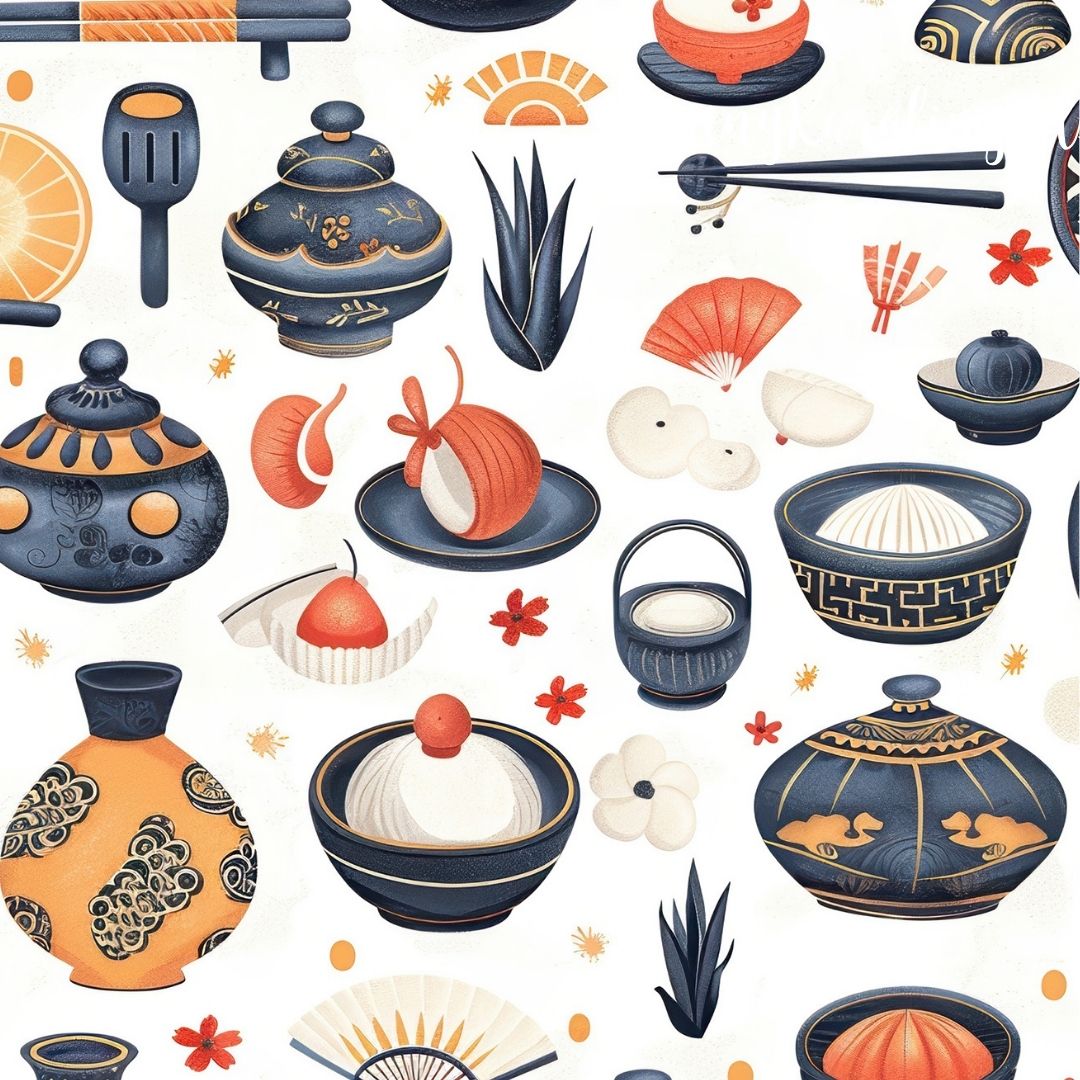 Smakowity wzór azjatycki - wazy, miseczki, kwiatki, potrawy na jasnym tle.