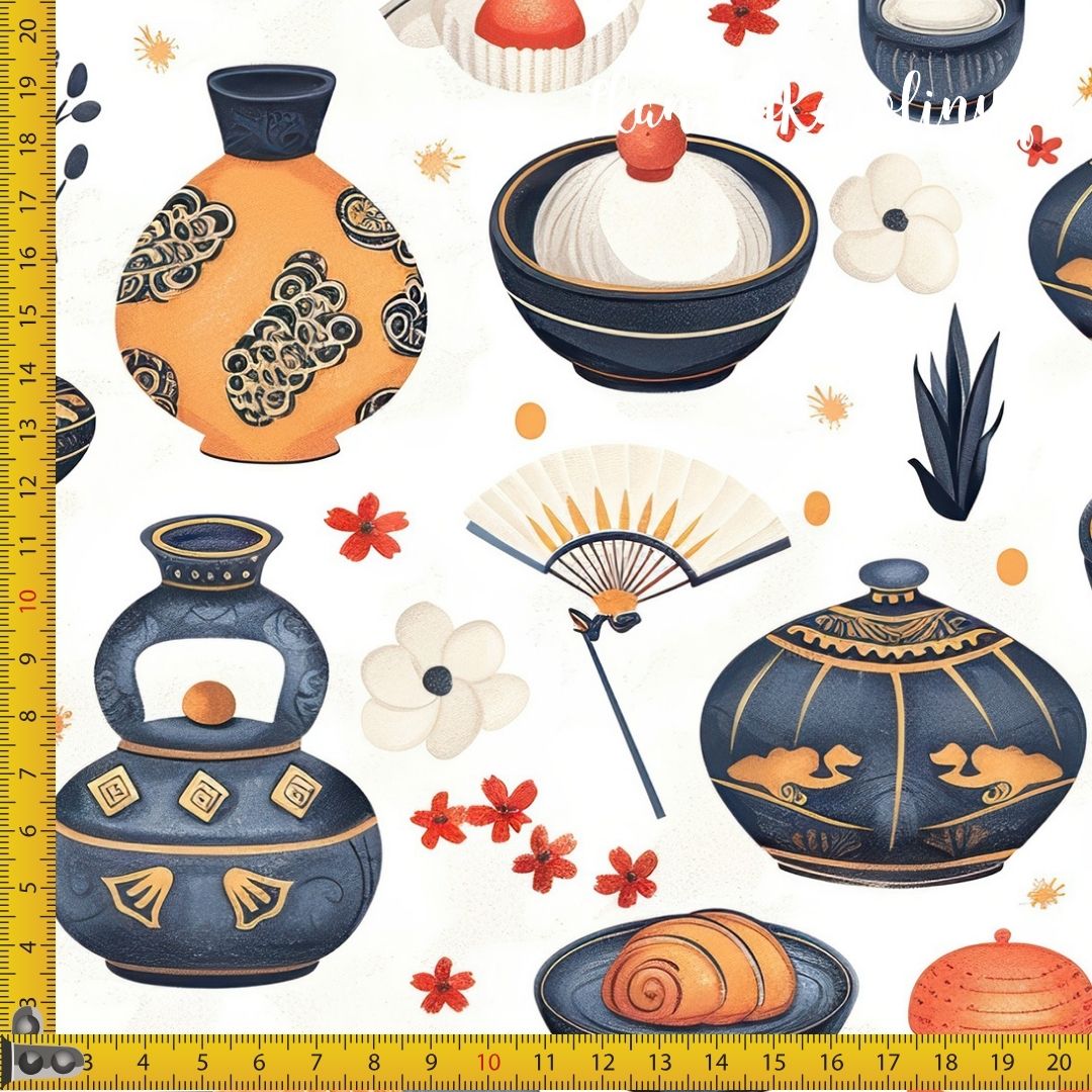 TKANINA WODOODPORNA OXFORD Wzory orientalne - naczynia, wachlarze, potrawy na jasnym tle [6-8]