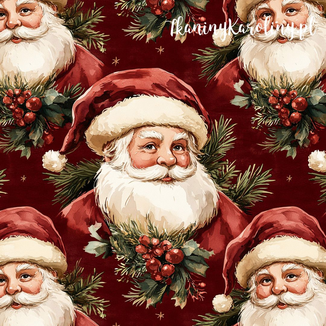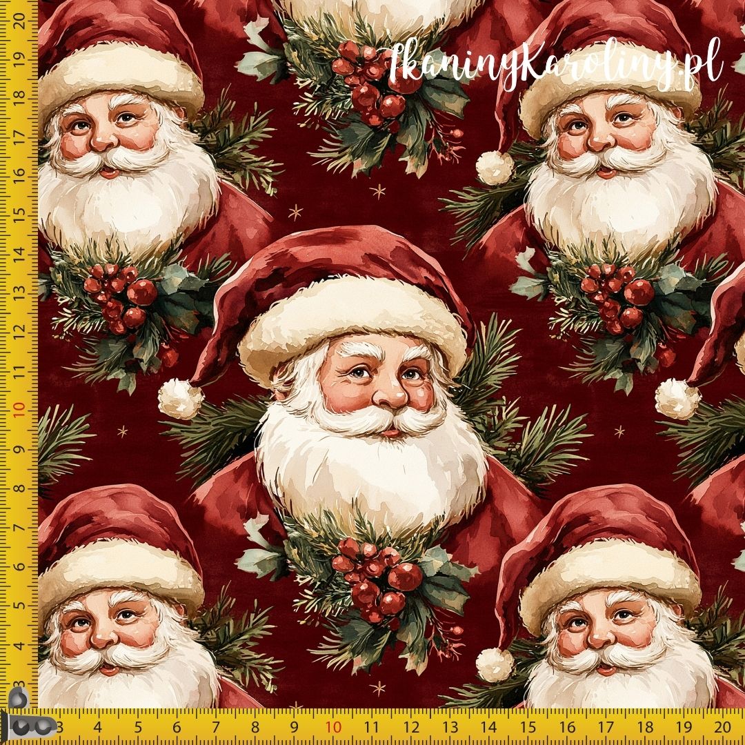 TKANINA WODOODPORNA OXFORD Wzory świąteczne - Święty Mikołaj na bordowym tle z gałązką [6-8]