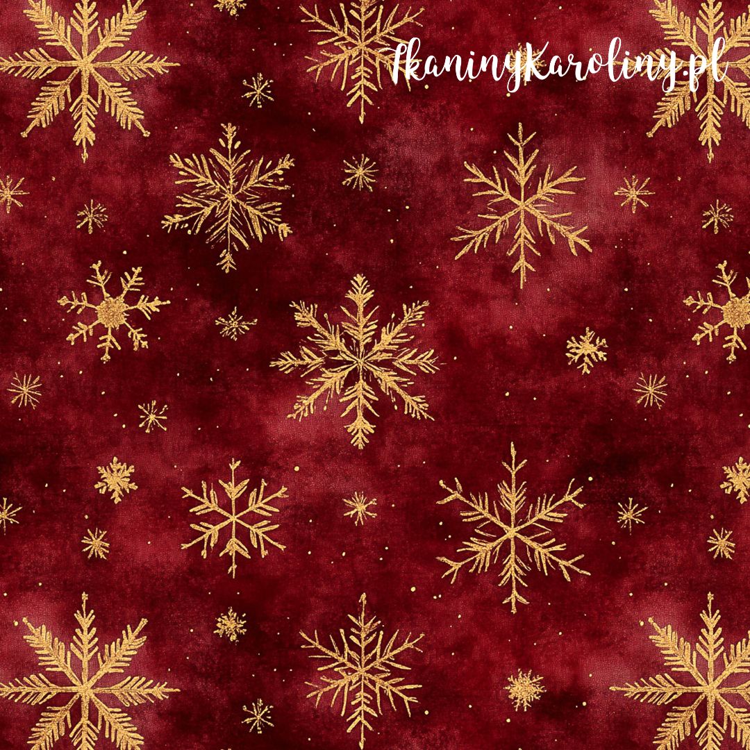 Złote płatki śniegu rozsypały się na różnych odcieniach czerwieni – jak zimowa mgiełka zamieniona w świąteczne konfetti.