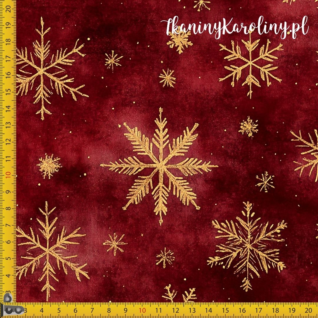 TKANINA WODOODPORNA OXFORD Wzory świąteczne - złote płatki śniegu na ocieniach czerwieni [6-8]