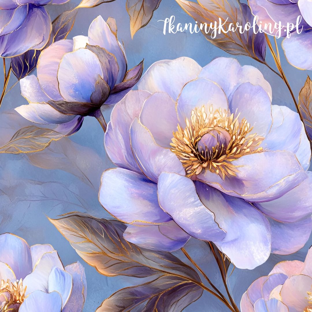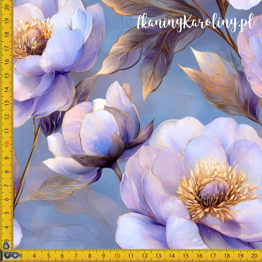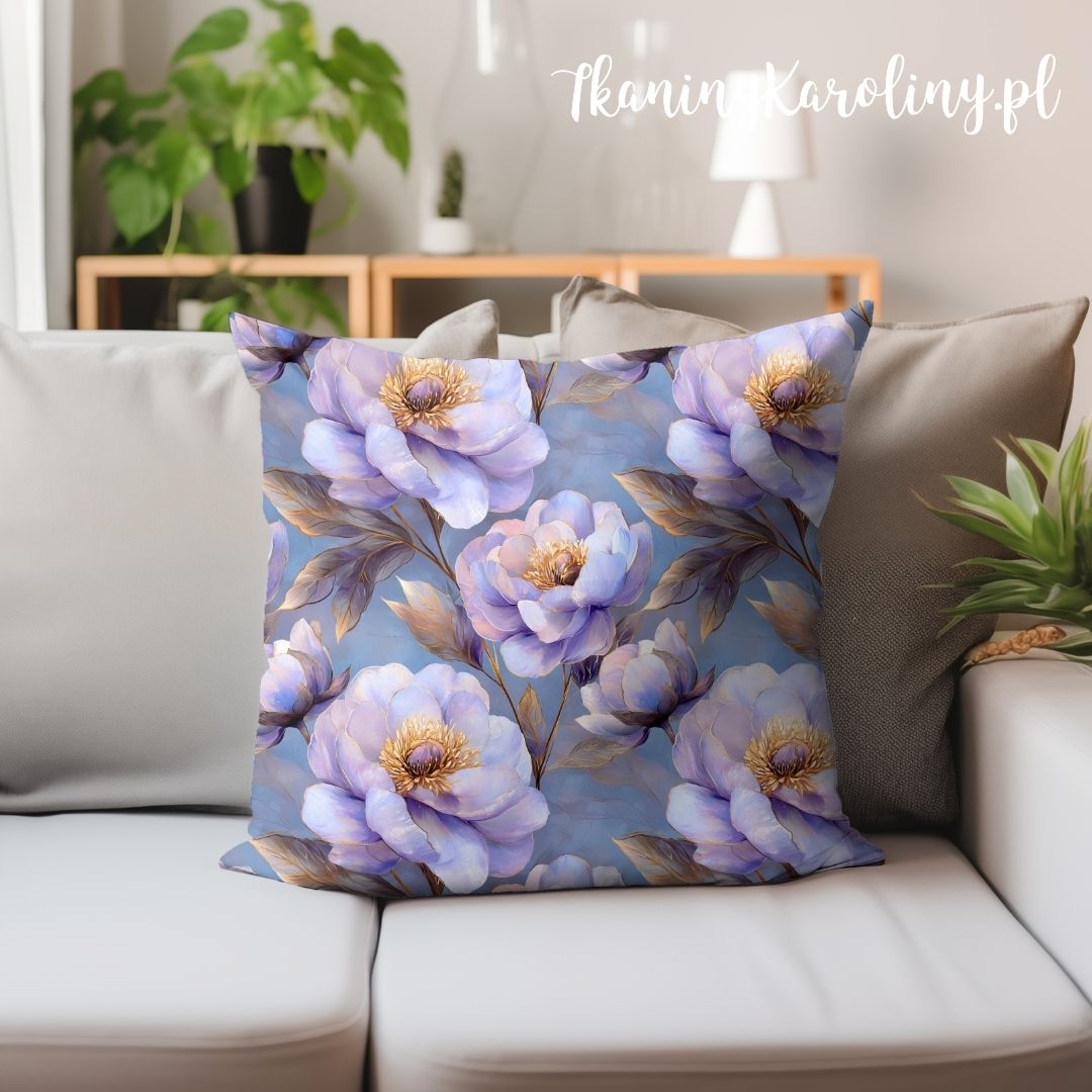 WELUR TAPICERSKI DRUKOWANY Piwonie perłowe 9 - fioletowe kwiaty na niebieskim tle [6-8]