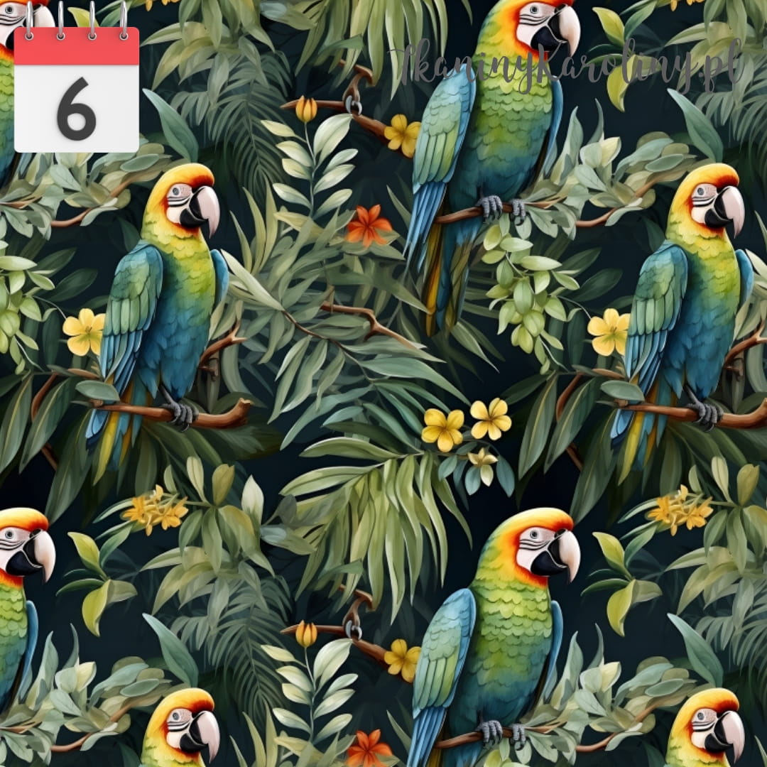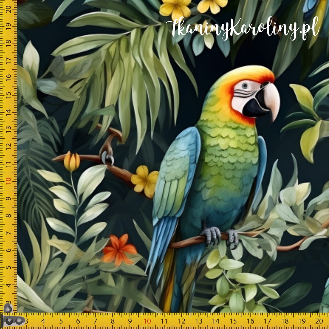 WELUR TAPICERSKI DRUKOWANY W dżungli Papugi 6 - zielono żółte na czarnym [6-8]