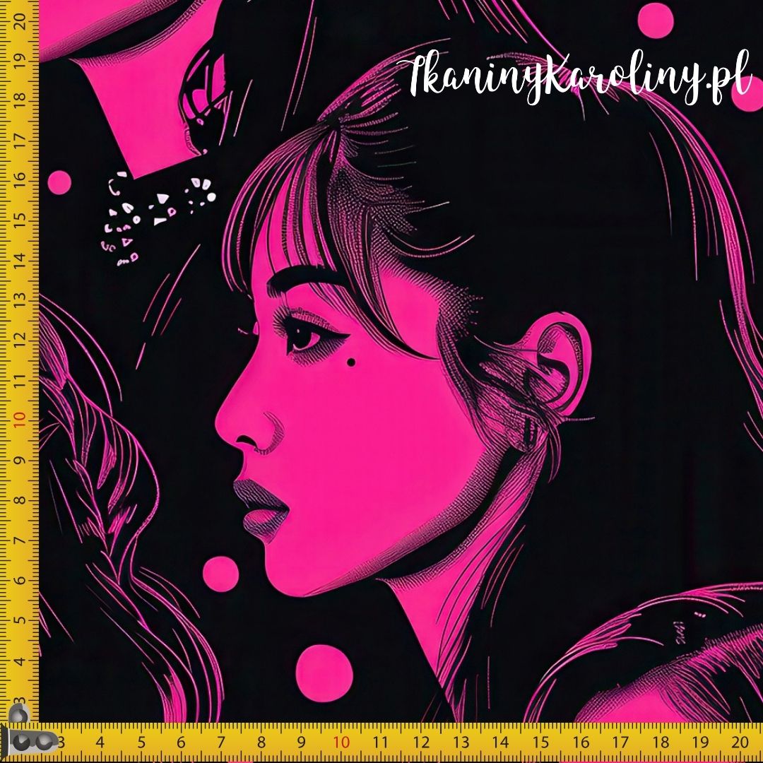 Ciemny, muzyczny print z intensywnym odcieniem różu - dziewczyny K-POP na czarnym tle, różowe kropeczki.