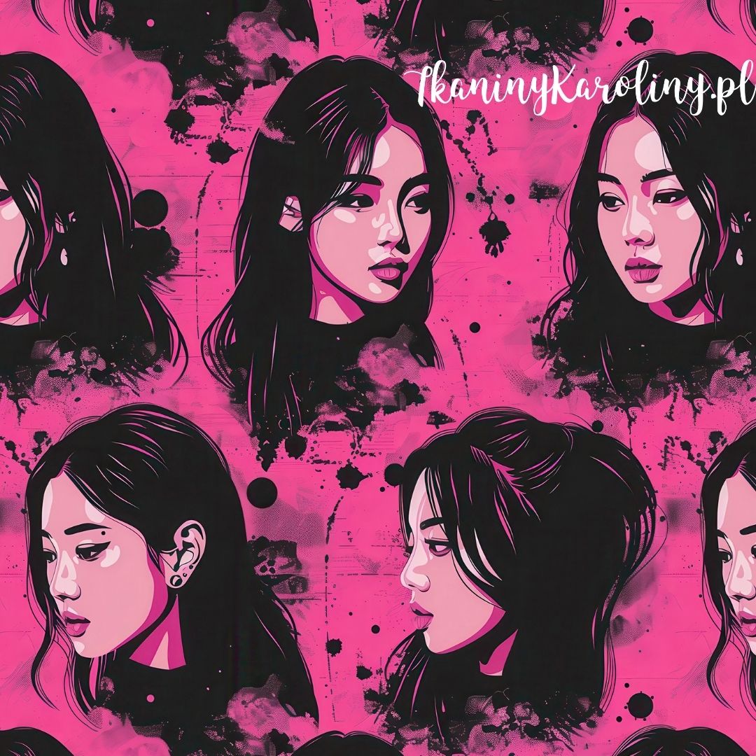 Wzór K-POP z twarzami dziewczyn na różowo-czarnym tle z artystycznym efektem splash.