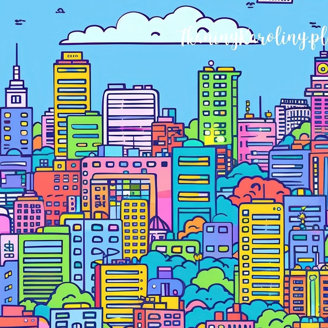 Pozytywnie zakręcony, wielokolorowy wzór miasta z wieżowcami i niebieskim niebem w tle.