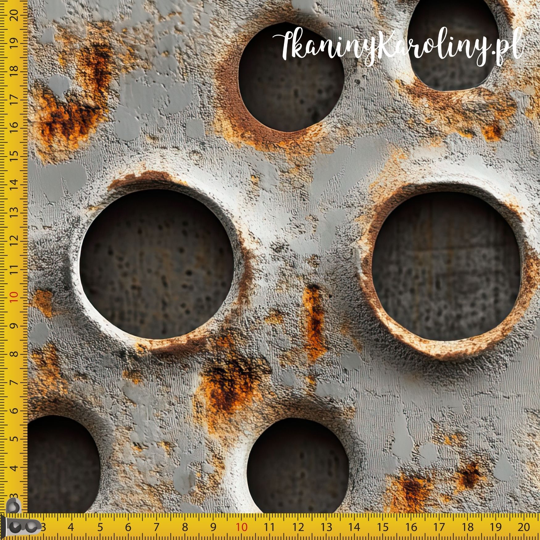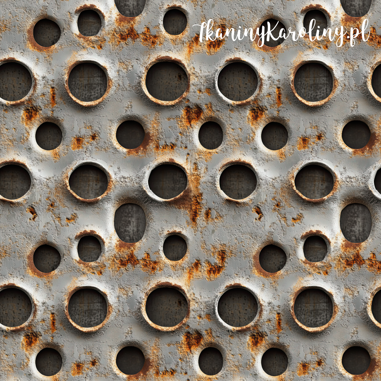 Powierzchnia metalu została odwzorowana z dużą precyzją – widoczne są ślady zużycia, rdzawa patyna, przetarcia oraz nierówności, które przełamują chłodne, stalowe tło ciepłymi odcieniami rdzy i brązu. Otwory tworzą efekt głębi i rytmu, nadając wzorowi dynamiczny, surowy charakter.
