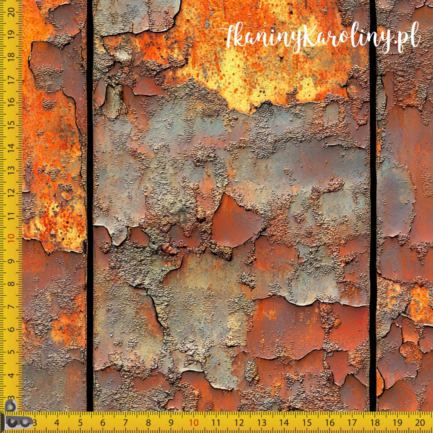 Ten wzór inspirowany jest powierzchnią starej, przemysłowej blachy pokrytej warstwami łuszczącej się farby i naturalnej rdzy. Nieregularna faktura oraz wyraźne przejścia kolorystyczne pomiędzy odcieniami szarości, brązu i intensywnej pomarańczowej rdzy tworzą efekt surowej, autentycznej patyny. Pionowy układ elementów dodatkowo podkreśla charakter wzoru i nadaje mu rytmiczną, zdecydowaną formę.