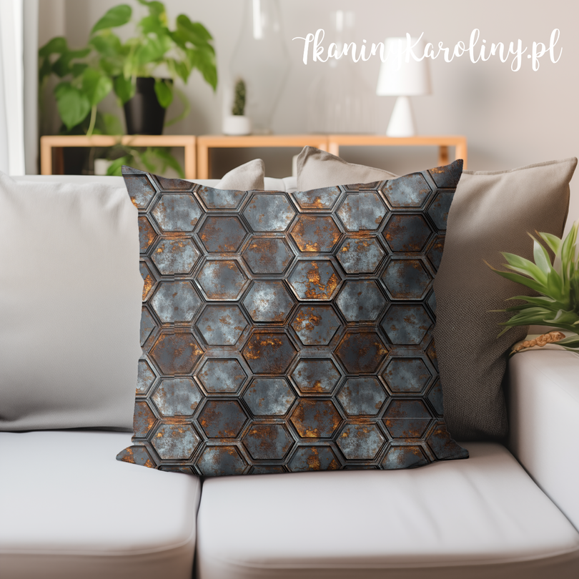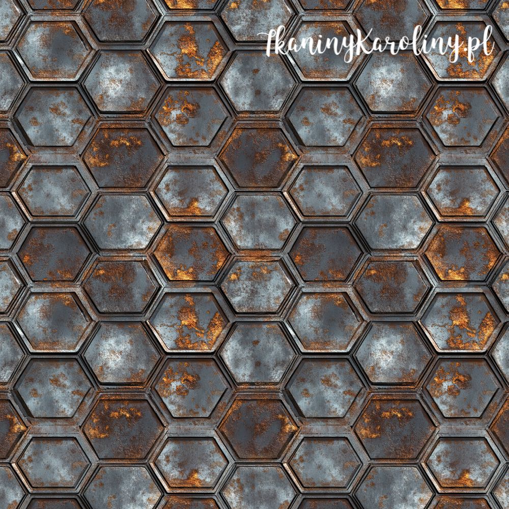 Industrialny wzór inspirowany heksagonalną strukturą metalowych płyt, przywodzącą na myśl stalowe panele techniczne i przemysłowe poszycia. Regularny układ sześciokątów tworzy wyrazistą, geometryczną kompozycję, w której chłodne odcienie stali i grafitu przełamane są rdzawymi przetarciami i śladami naturalnego zużycia metalu.