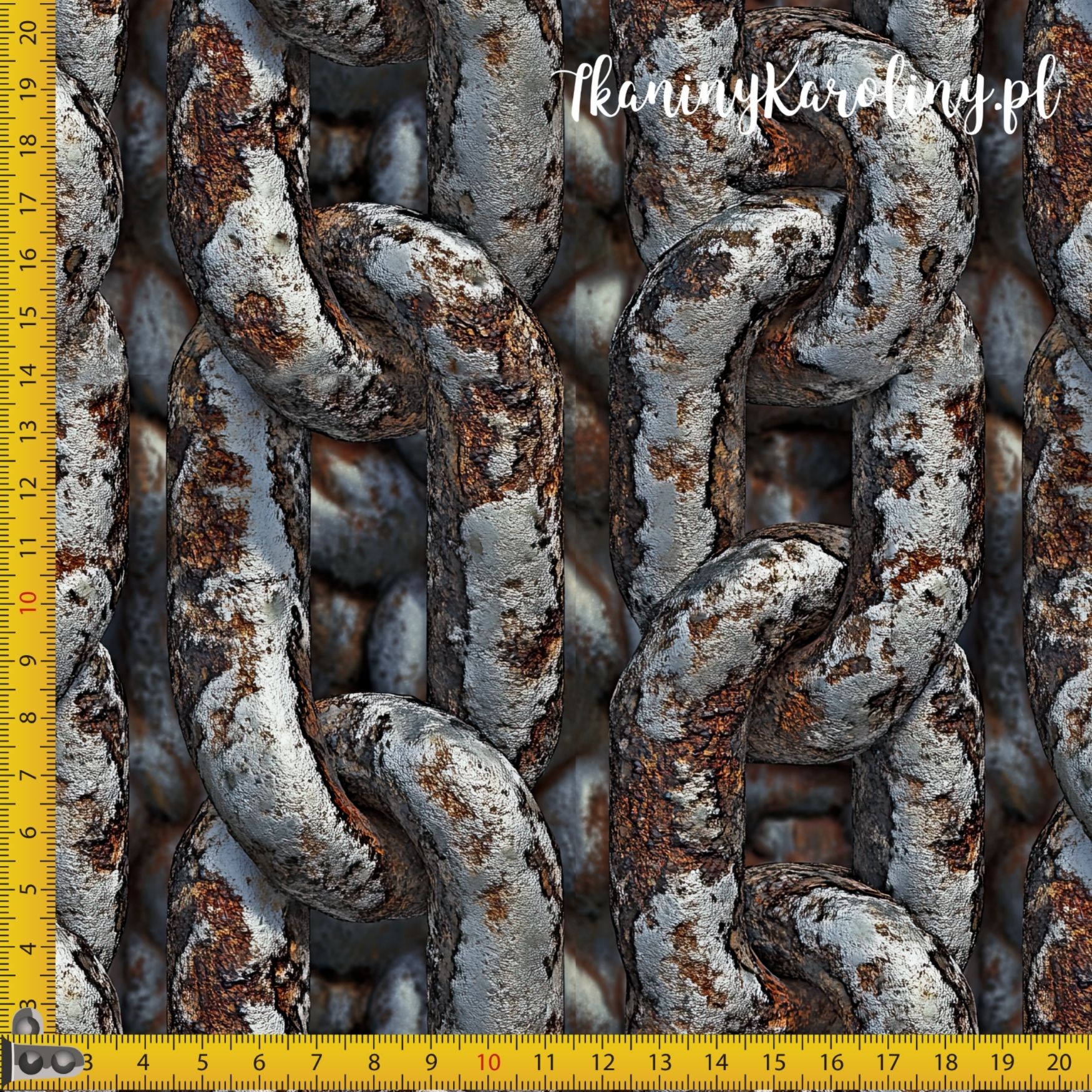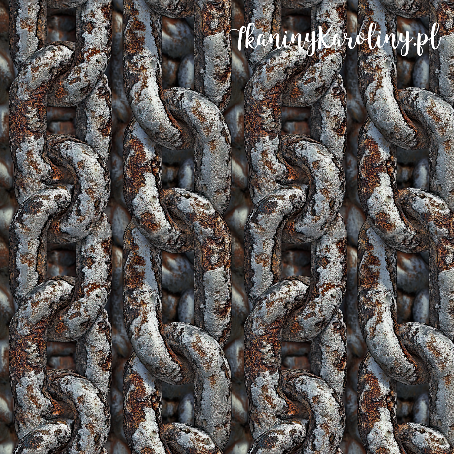 Mocny, industrialny wzór inspirowany masywnym, stalowym łańcuchem pokrytym śladami rdzy i patyny. Motyw przedstawia gęsto splecione ogniwa o wyraźnej, chropowatej fakturze, w której przeplatają się odcienie grafitowej szarości, ciemnego metalu oraz rdzawych brązów i pomarańczy.
