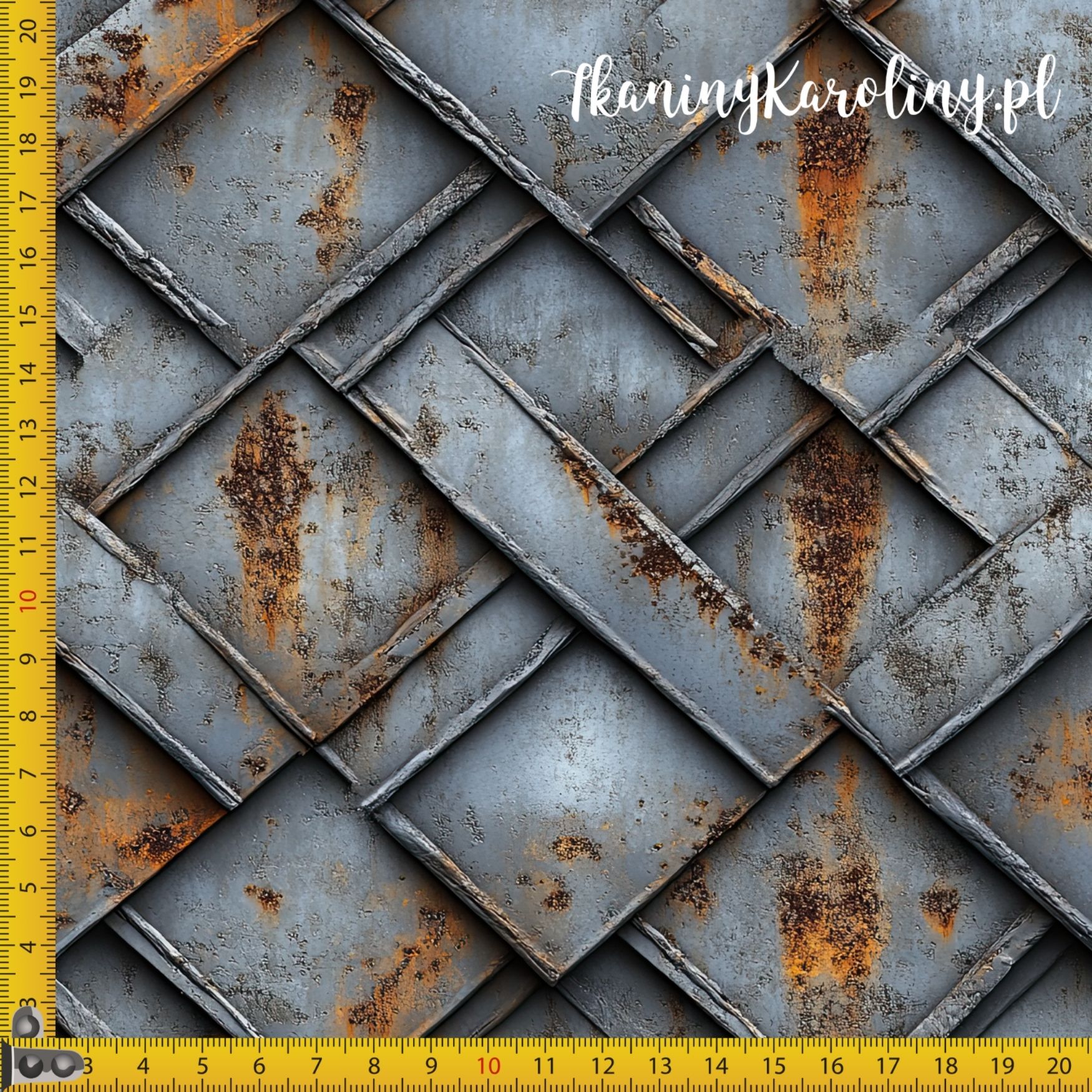Powierzchnia metalu została odwzorowana z dużą dbałością o detal – widoczne są przetarcia, nieregularności, ślady zużycia oraz rdzawa patyna, przełamująca chłodne odcienie szarości i stali. Ciepłe, rdzawe akcenty nadają wzorowi charakteru i podkreślają jego surowy, industrialny styl.