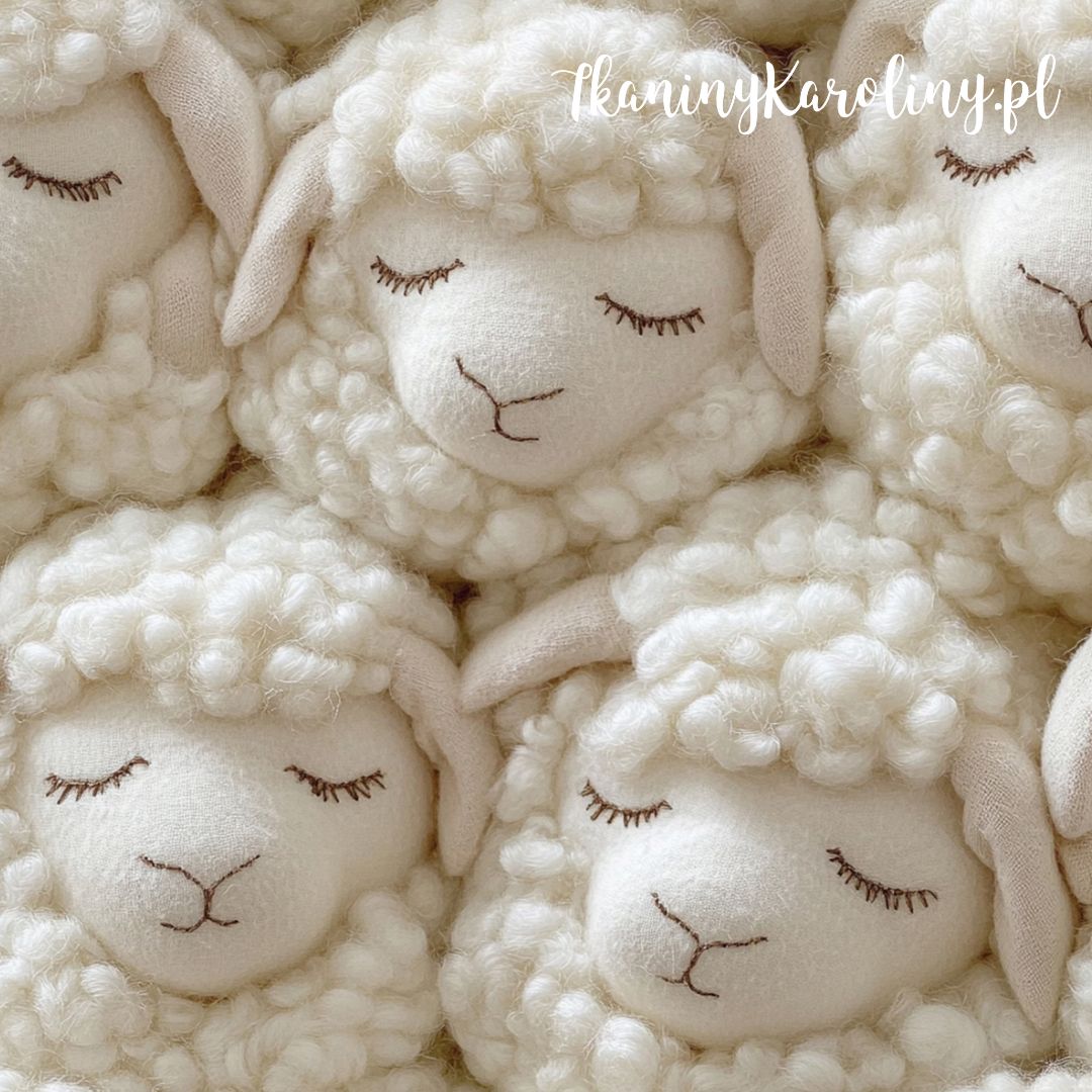 Uśmiechnięte, śpiące owieczki w stonowanej kolorystyce. Wzór doskonały do dziecięcego pokoju, na dekoracyjne poduszki, pufy lub zasłony :) Sprawdzi się bardzo dobrze również do renowacji mebli dziecięcych.