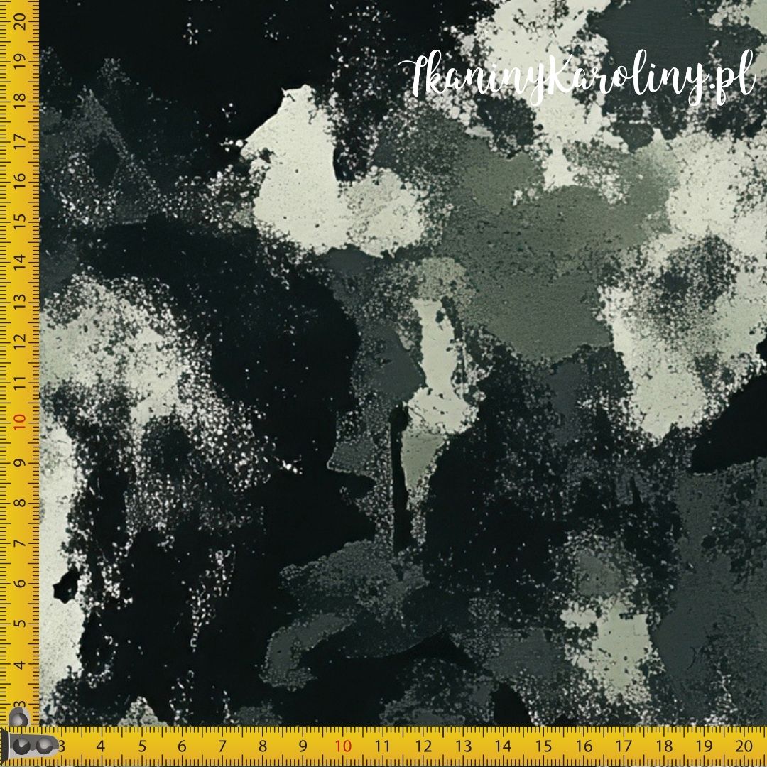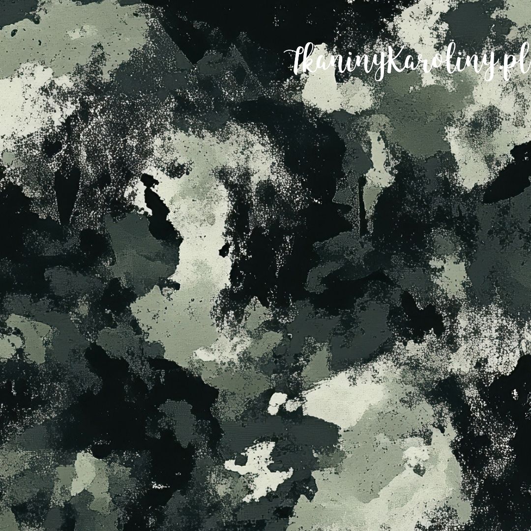Nowoczesny wzór moro w odcieniach czerni, grafitu i szarości. Rozmyte plamy tworzą efekt surowego, miejskiego kamuflażu. Idealny wybór na dodatki w stylu militarnym oraz dekoracje wnętrz w industrialnym klimacie.