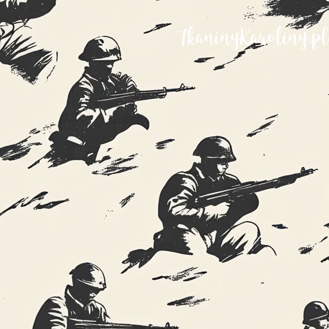 Przyjemny dla oka, dwukolorowy wzór wojskowy z żołnierzami na tle beżowym.