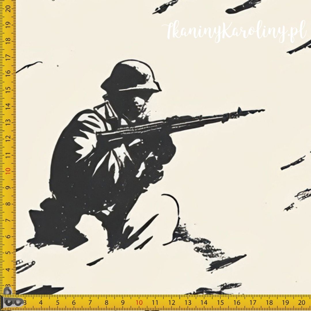 WELUR TAPICERSKI Wojskowy - dwukolorowy wzór, żołnierze z karabinami skierowani w prawo na beżowym tle [6-8]